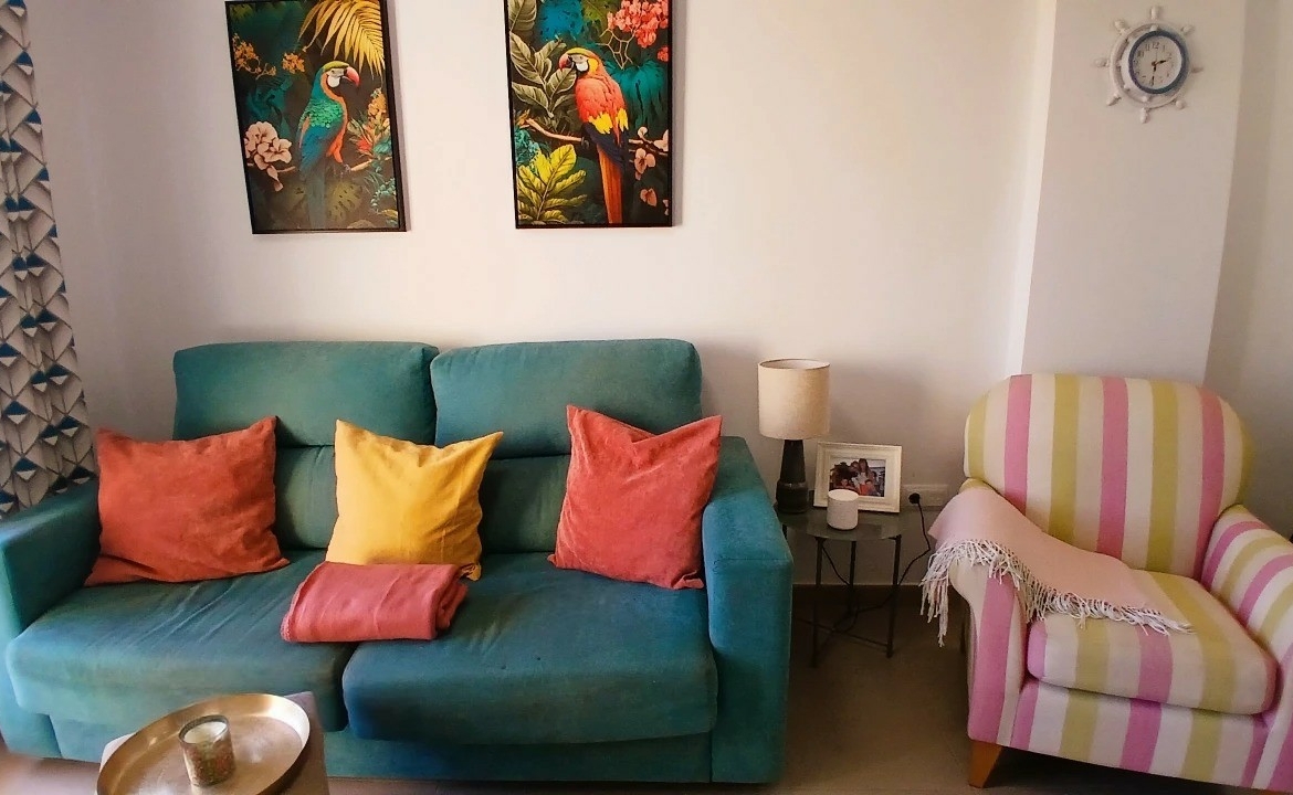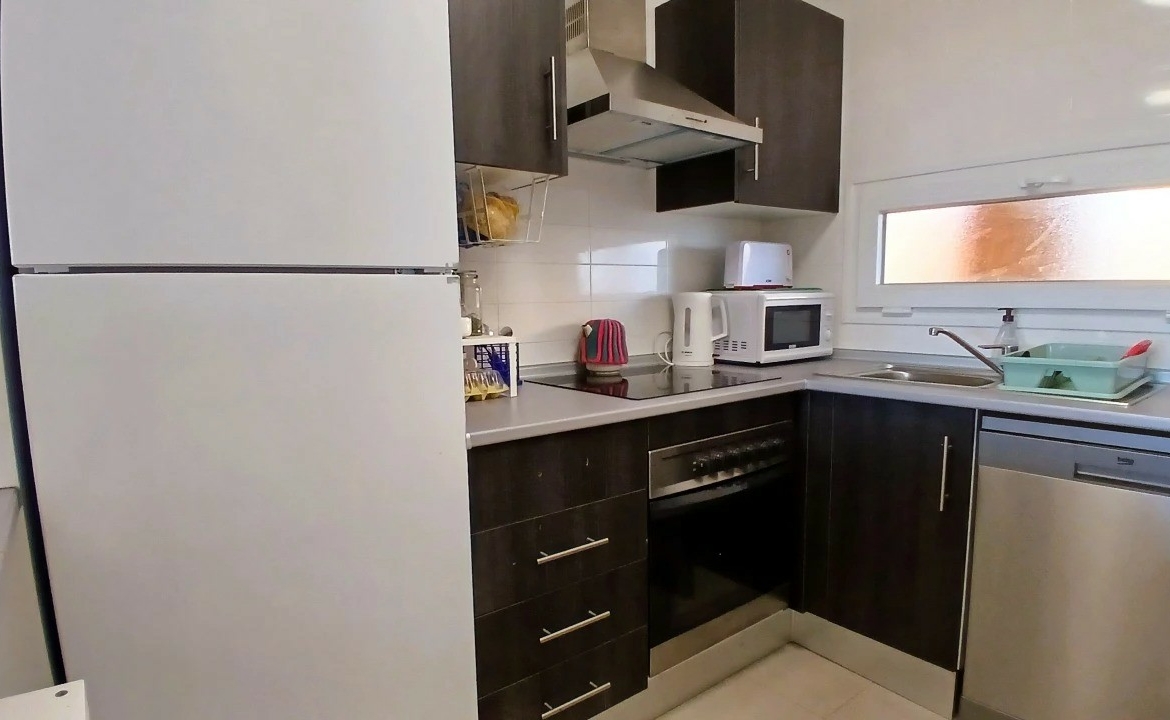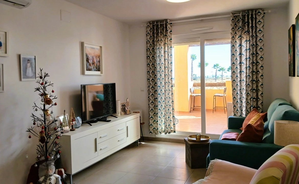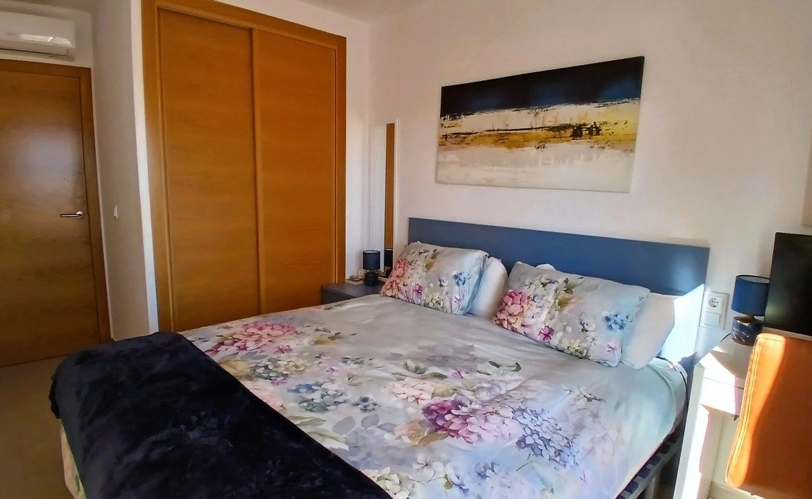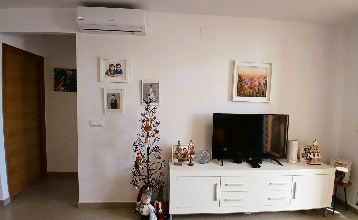 The apartment is being sold furnished and ready to move into, with air-conditioning in the living room and bedrooms. There are two bedrooms, a living room with doors opening to the terrace, fitted kitchen with appliances and a family bathroom.