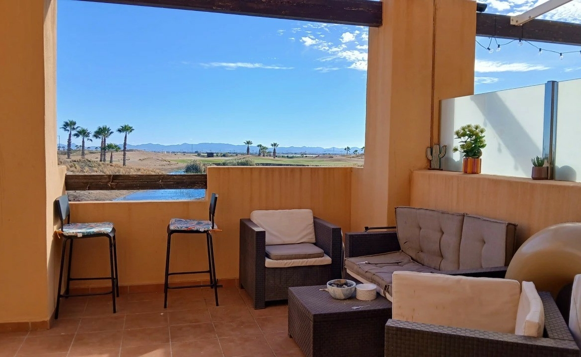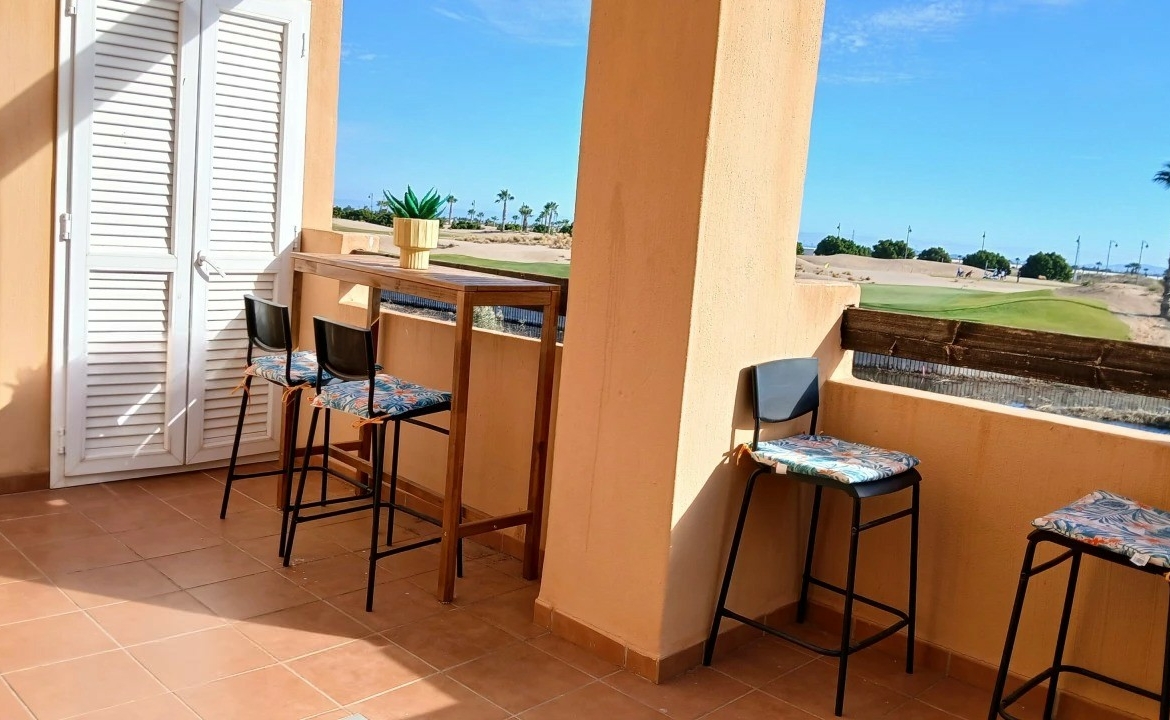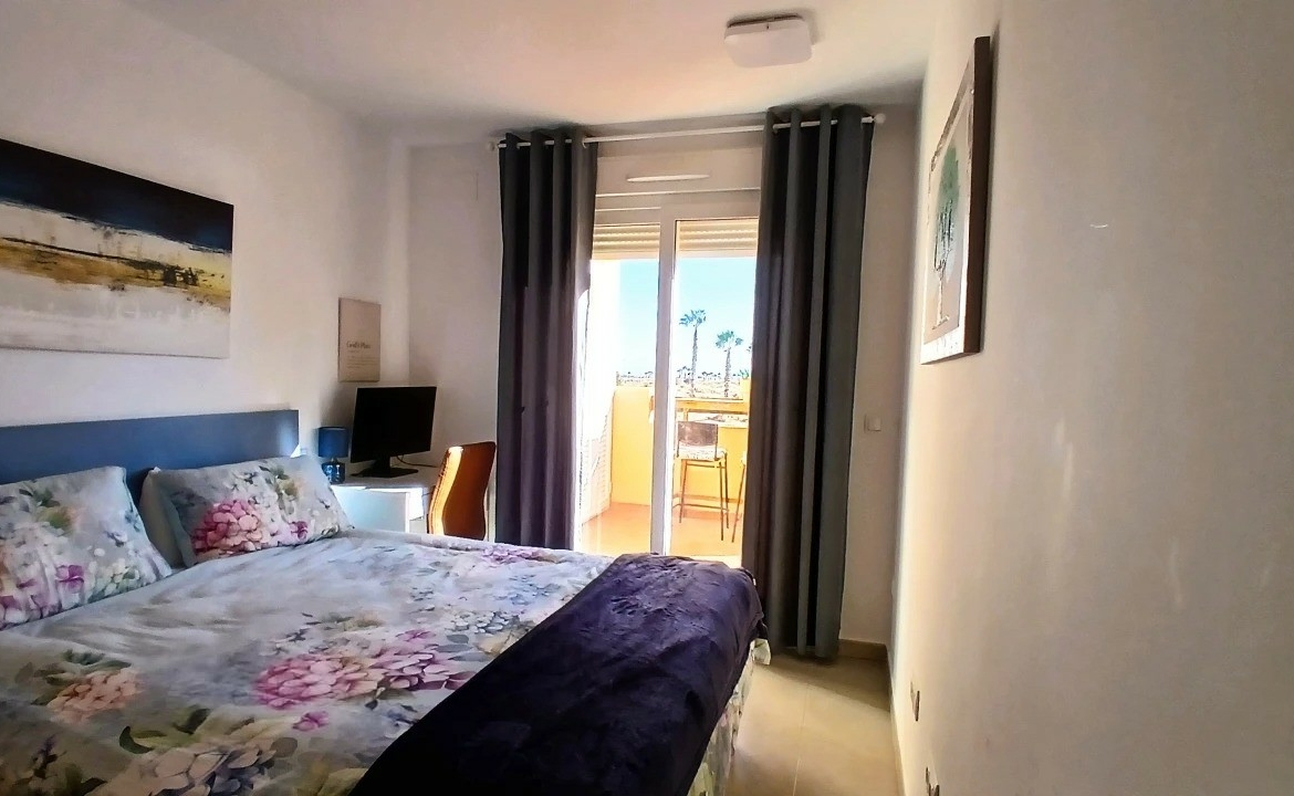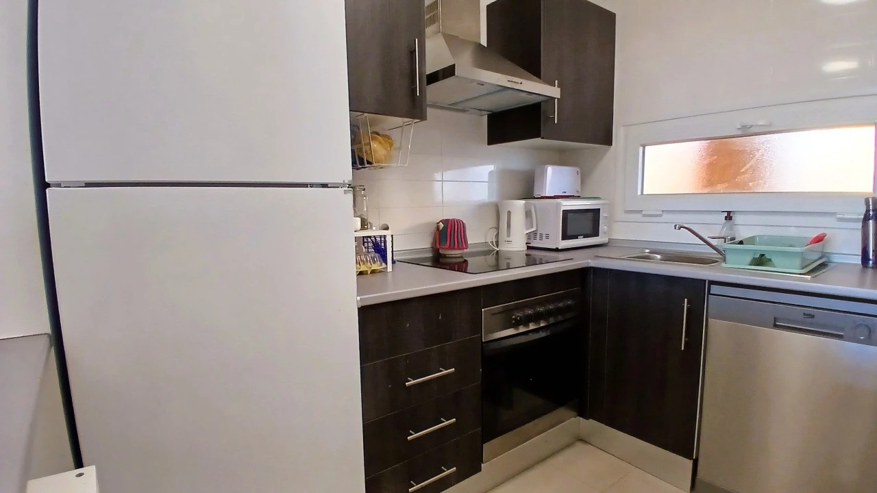 The apartment is being sold furnished and ready to move into, with air-conditioning in the living room and bedrooms. There are two bedrooms, a living room with doors opening to the terrace, fitted kitchen with appliances and a family bathroom.