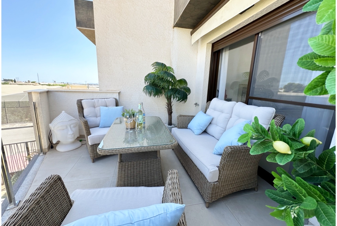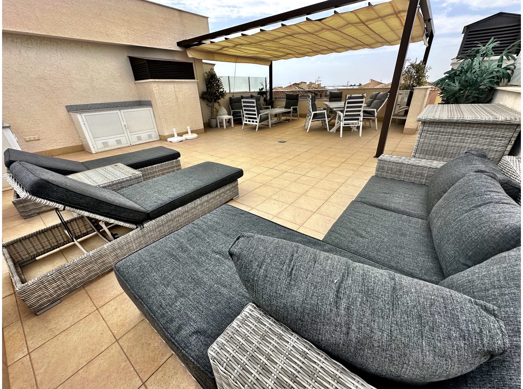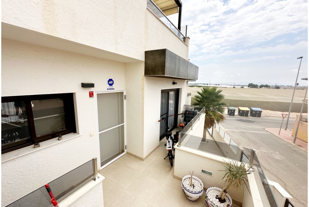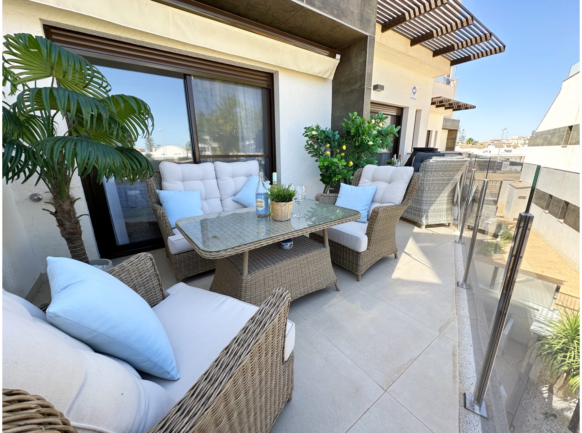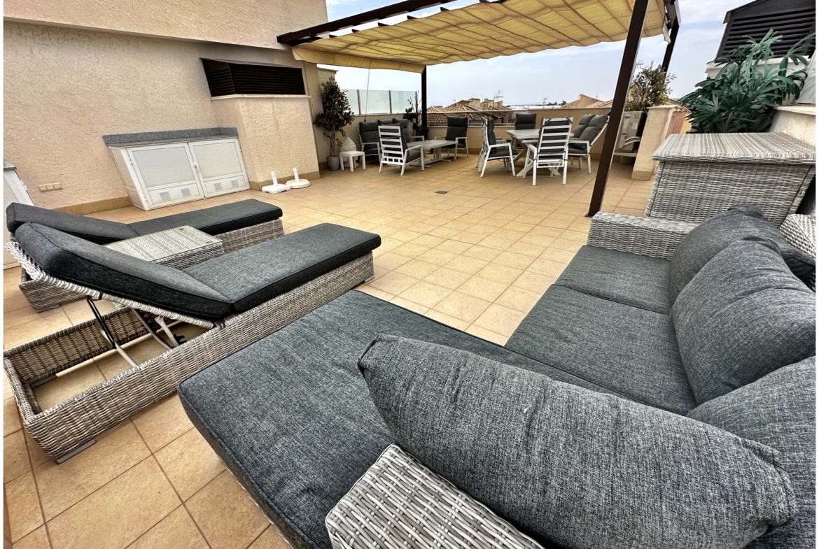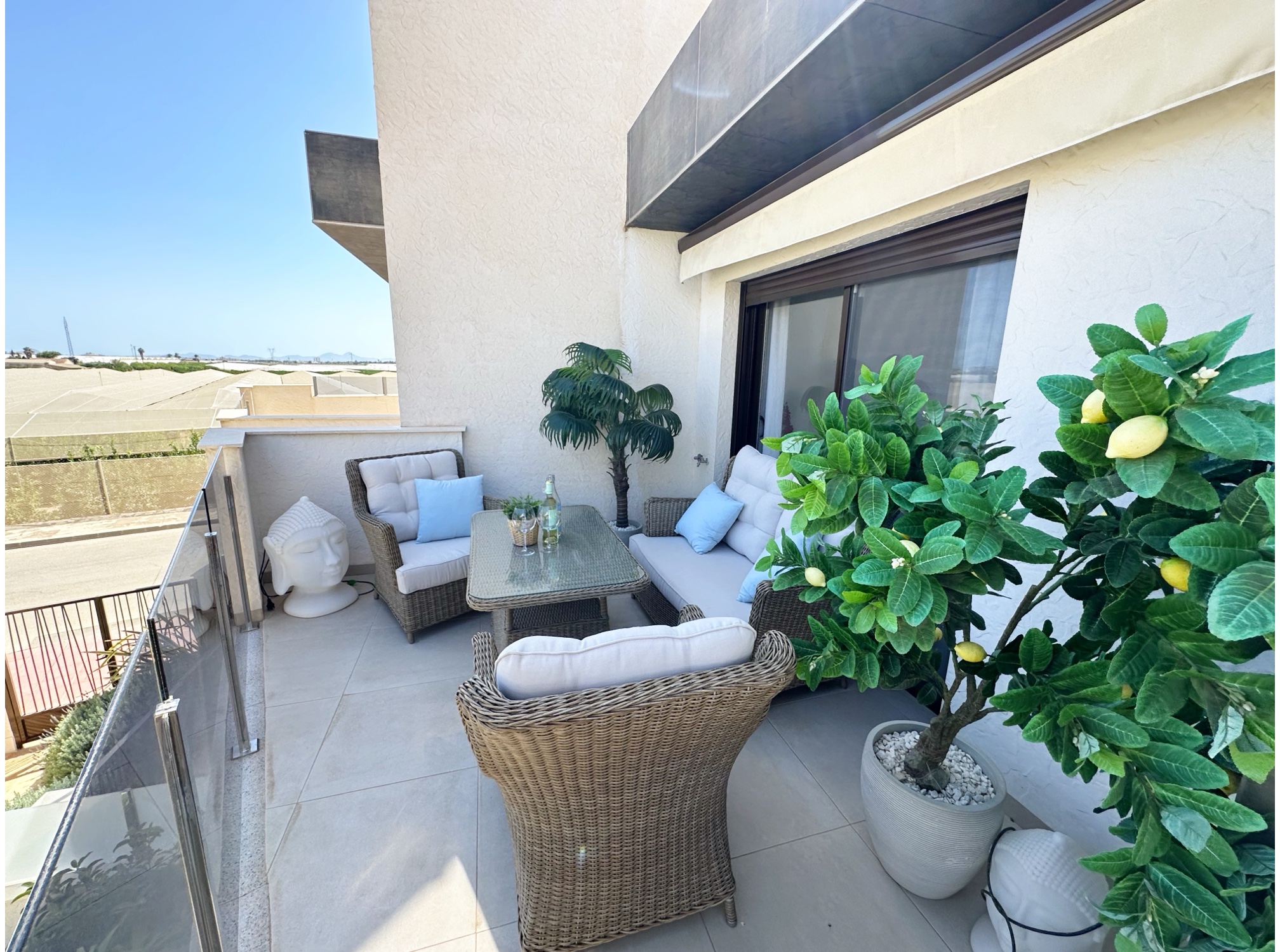We are delighted to offer for sale this fabulous two bedroom two bathroom apartment with huge solarium for sale in Dolores de Pacheco. Dolores is a wonderful town with several bars, restaurants and supermarket. It is a 5 minute walk to the village of Roda and a 5 minute drive to the beaches of the Mar Menor in Los Alcazares. The owners have put in a lot of love decorating this property, the furniture is included and is of extremely high quality. Vented aircon is throughout the property, fly screens on doors and awnings on the terrace of the lounge master bedroom and on the roof solarium. The apartment is on the first floor and has a larger than average roof solarium. You also have access to a shared private pool.