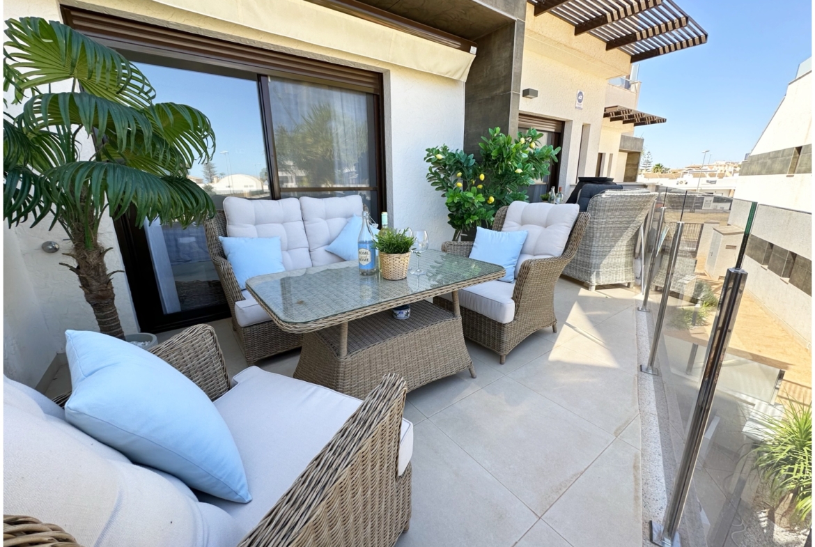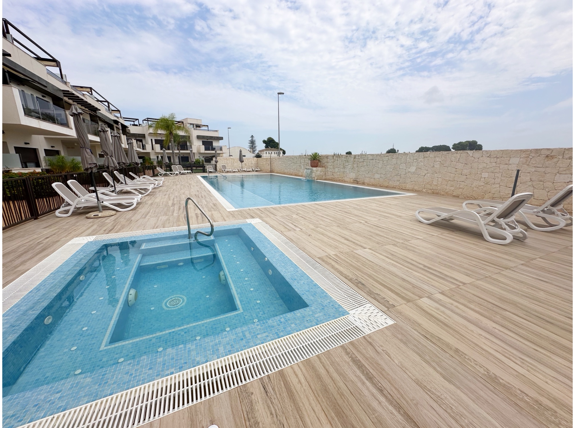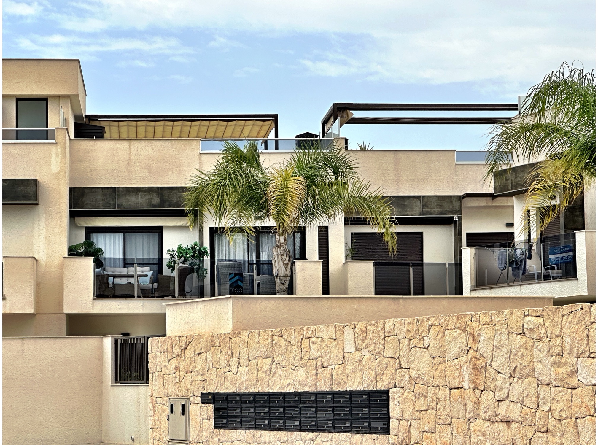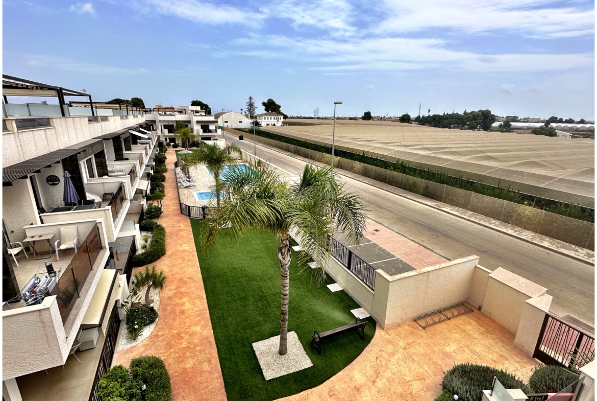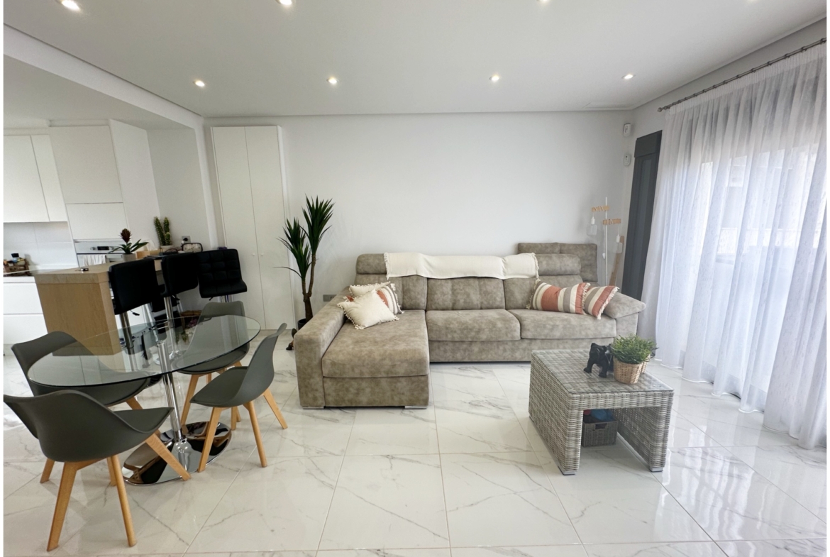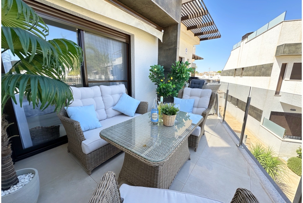 We are delighted to offer for sale this fabulous two bedroom two bathroom apartment with huge solarium for sale in Dolores de Pacheco. Dolores is a wonderful town with several bars, restaurants and supermarket. It is a 5 minute walk to the village of Roda and a 5 minute drive to the beaches of the Mar Menor in Los Alcazares. The owners have put in a lot of love decorating this property, the furniture is included and is of extremely high quality. Vented aircon is throughout the property, fly screens on doors and awnings on the terrace of the lounge master bedroom and on the roof solarium. The apartment is on the first floor and has a larger than average roof solarium. You also have access to a shared private pool.