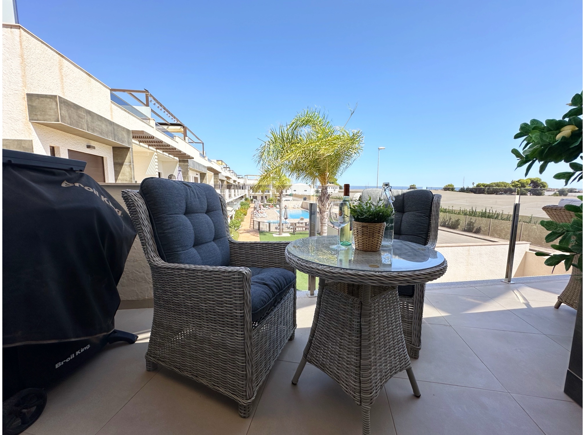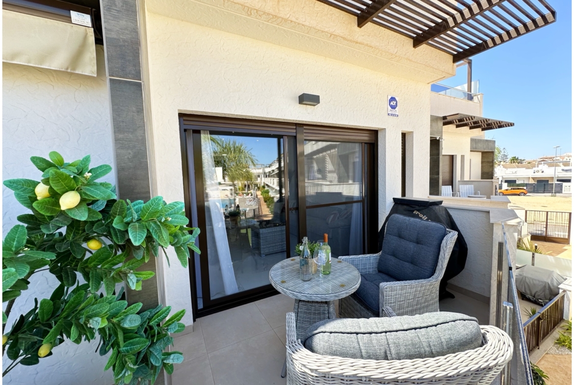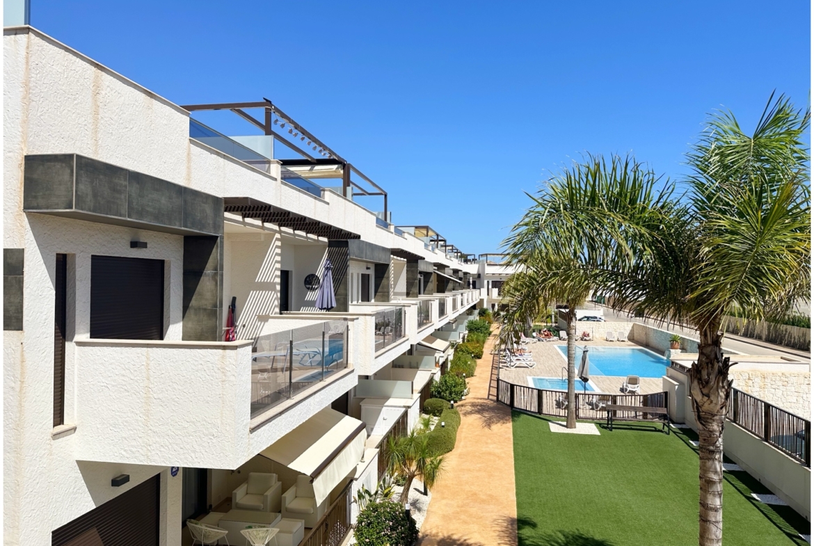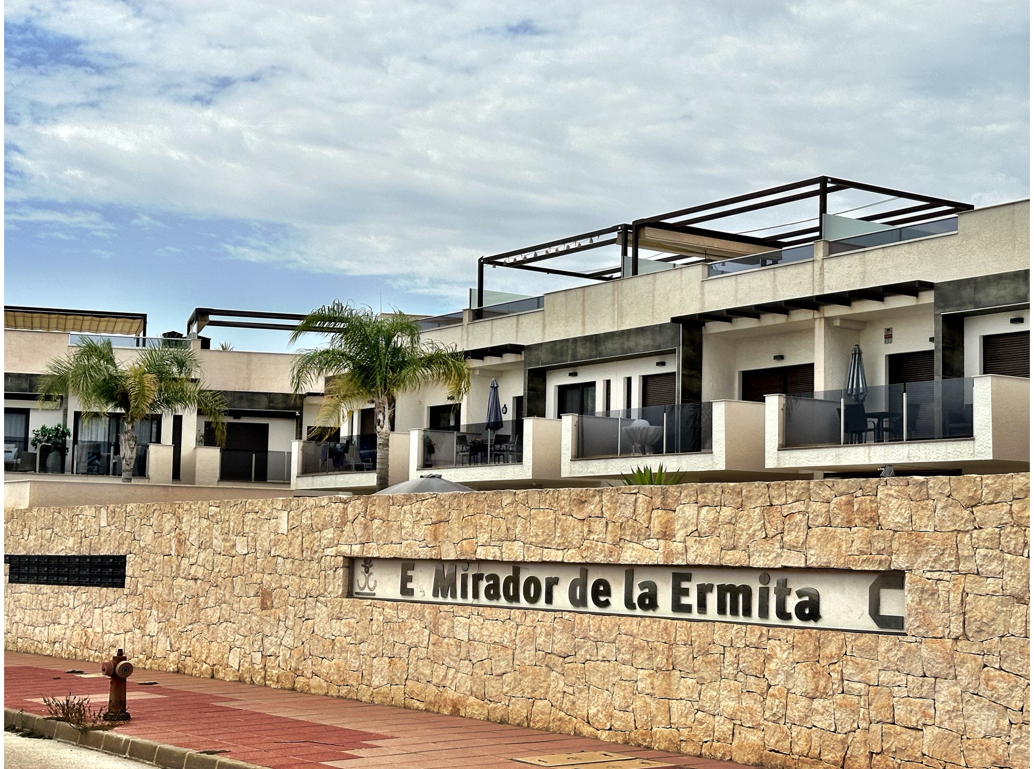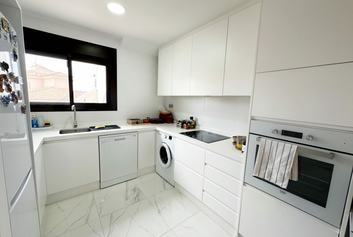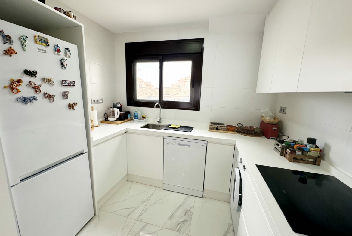 We are delighted to offer for sale this fabulous two bedroom two bathroom apartment with huge solarium for sale in Dolores de Pacheco. Dolores is a wonderful town with several bars, restaurants and supermarket. It is a 5 minute walk to the village of Roda and a 5 minute drive to the beaches of the Mar Menor in Los Alcazares. The owners have put in a lot of love decorating this property, the furniture is included and is of extremely high quality. Vented aircon is throughout the property, fly screens on doors and awnings on the terrace of the lounge master bedroom and on the roof solarium. The apartment is on the first floor and has a larger than average roof solarium. You also have access to a shared private pool.
