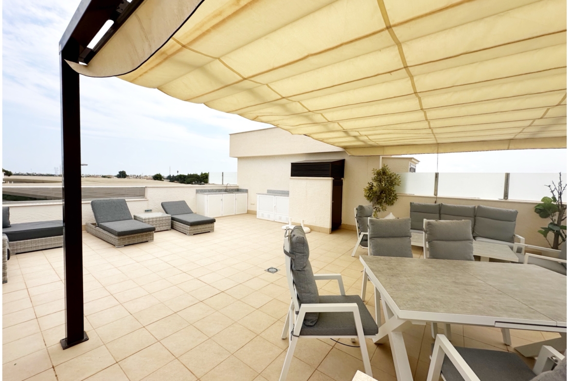 You enter the property via stairs to the first floor, there is a video intercom system and alarm installed. This leads to the first terrace where you will find front door and a further staircase leading to the roof solarium. This area is vast, the owners have dressed with some beautiful outdoor furniture, a lounge set, dining set and sunbeds. There is a large retractable awning, outdoor kitchen area and large storage cupboard. From the terrace you have wonderful views over the countryside, it really is wonderfully tranquil. Entering the property into the bright open plan living, diner and kitchen area. The floor is tiled with a high shine white and soft grey marble effect and inserted ceiling spots. The kitchen has modern white units with washing machine, fridge freezer and dishwasher, this follows to the dining area and lounge with large L shape sofa bed. Patio door access leads to a further large terrace accessed via the lounge and master bedroom with views over the communal swimming pool. Off the lounge are two double bedrooms both with floor to ceiling fitted wardrobes, the master having an ensuite shower room and a further separate guest shower room. The guest bedroom has patio doors to the front terrace. The apartment is stunning, presented to a very high standard and in very good condition. Please contact us to arrange a viewing.