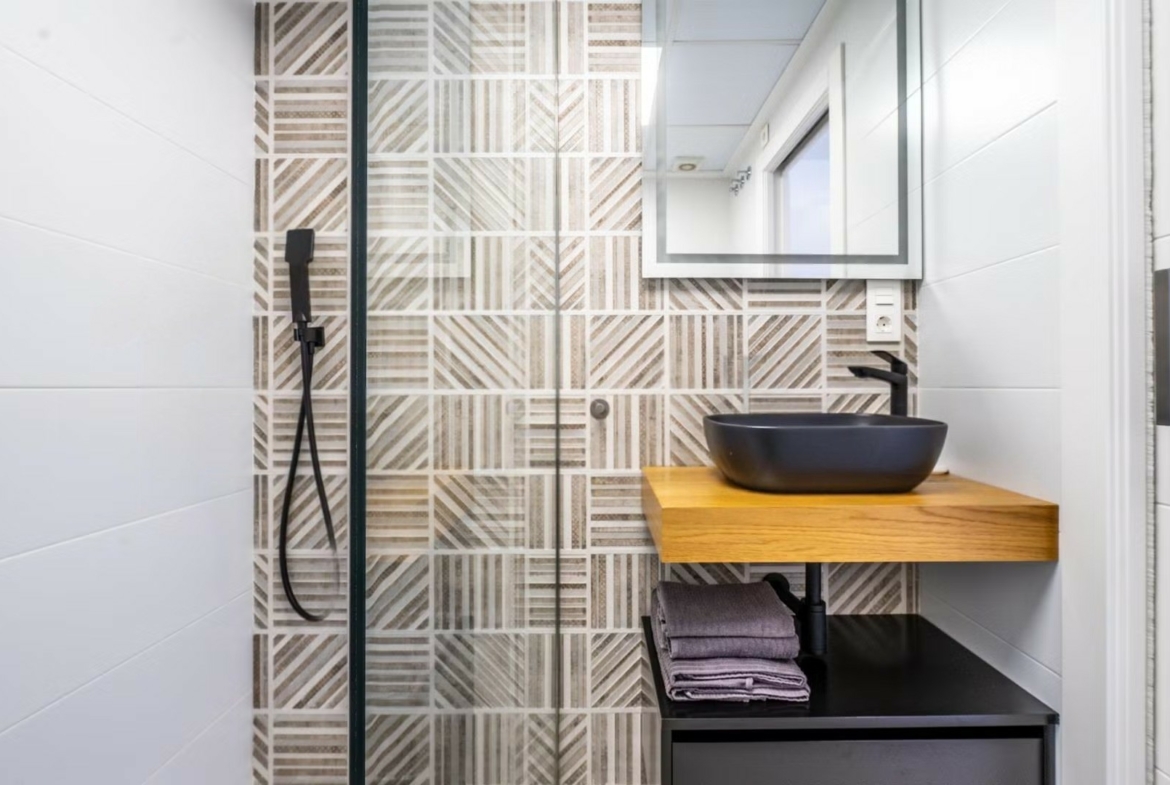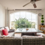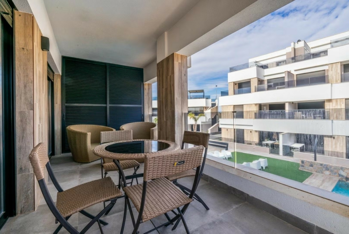 As you walk through the front door there is a generous bedroom to the right with superb fitted wardrobes and large window letting lots of light in, across the hall is a modern shower room. At the end of the corridor is the open plan kitchen with ample storage and a breakfast bar dining table. The lounge has patio doors to the terrace which has pool views. The master bedroom has fitted wardrobes and an ensuite stylish shower room and patio doors to the terrace. There is a communal pool with astroturf and terraces areas with seating. It comes with AC and option to buy parking space and storage room.