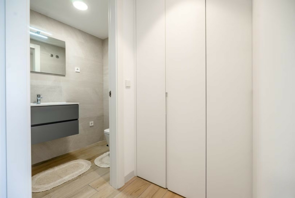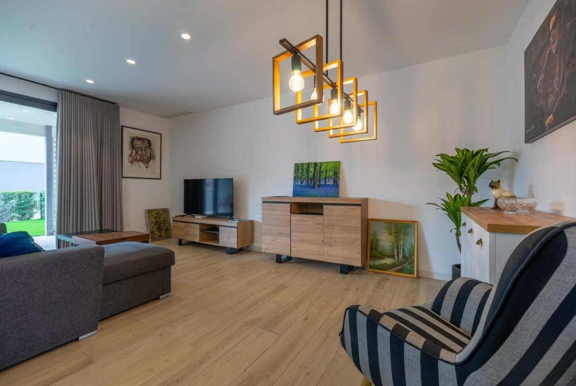 You enter through the garden and covered terrace to the front door which leads you into the open plan kitchen lounge diner. The kitchen has an island and a separate utility room. The loune is a great size and has large patio doors to the covered terrace and garden. Down the corridor is a family bathroom with a pocket door. Both bedrooms have fitted wardrobes and access to the rear garden and the master bedroom has an ensuite bathroom. There is underground parking and it comes with a storage room.