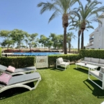From the lounge, sliding glass doors lead you to a fully enclosed covered terrace, featuring elegant glass curtains. This space is perfect for year-round use, offering a large dining table and a dedicated bar area—ideal for entertaining or simply enjoying a peaceful drink with a view. Beyond the terrace, you’ll find a private garden that opens directly onto the communal pool, with stunning views of both the pool and glimpses of the golf course.