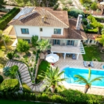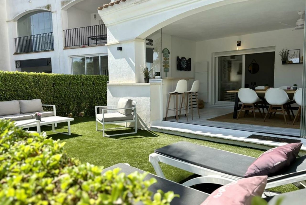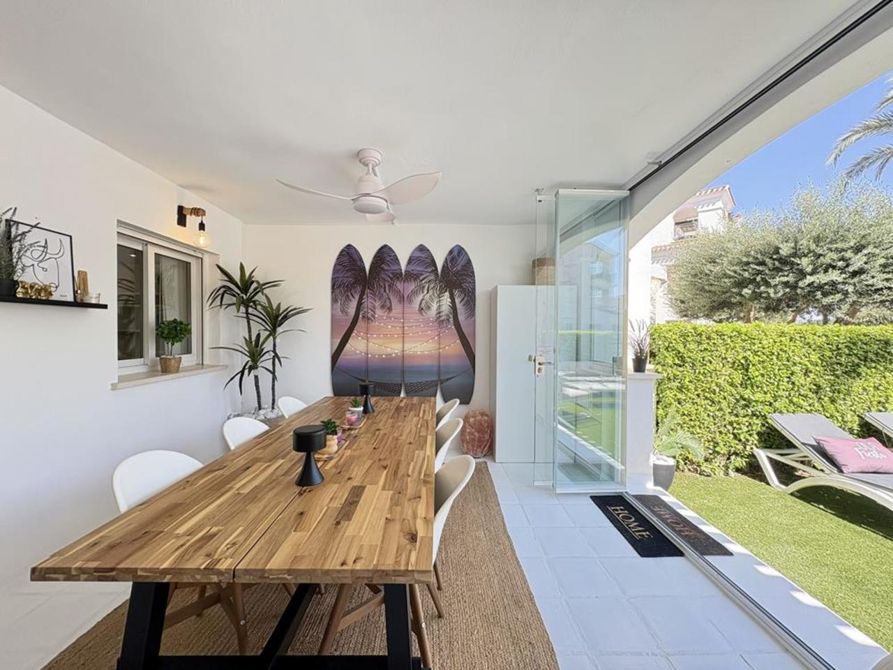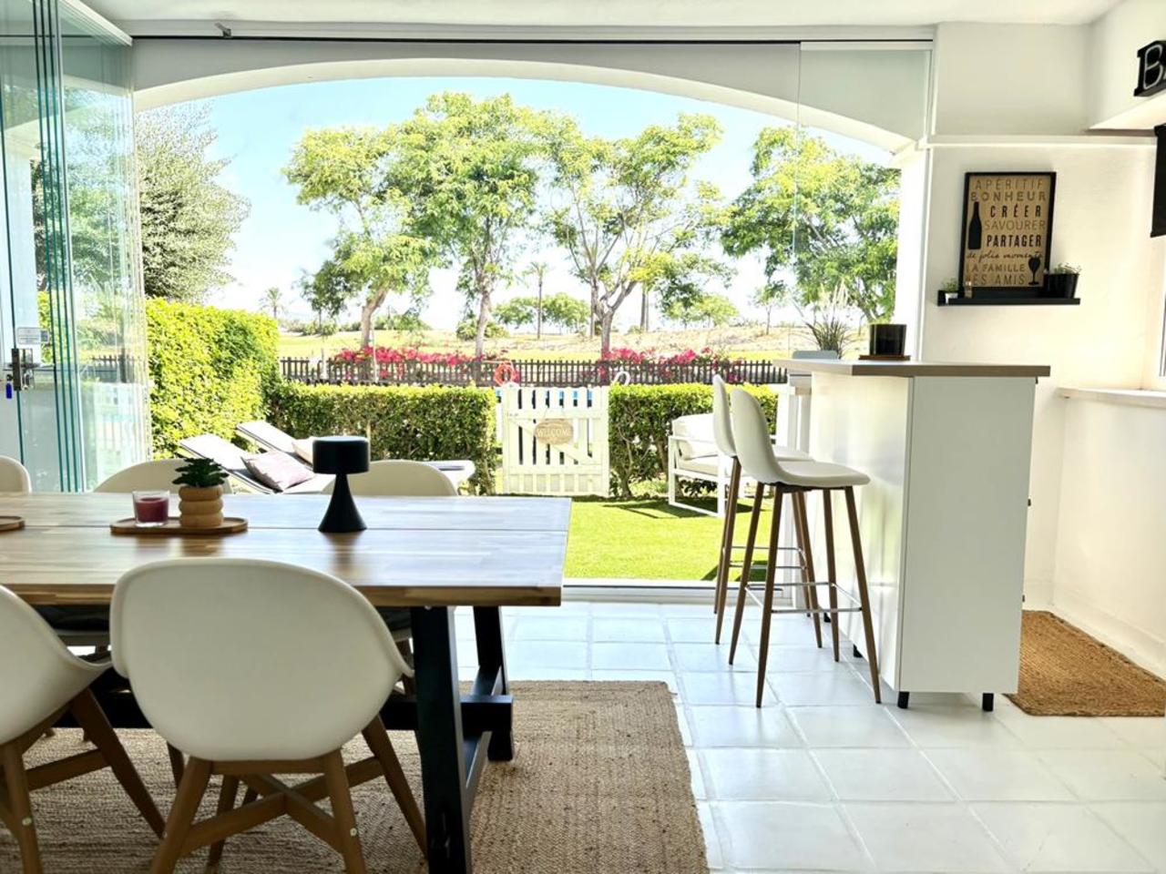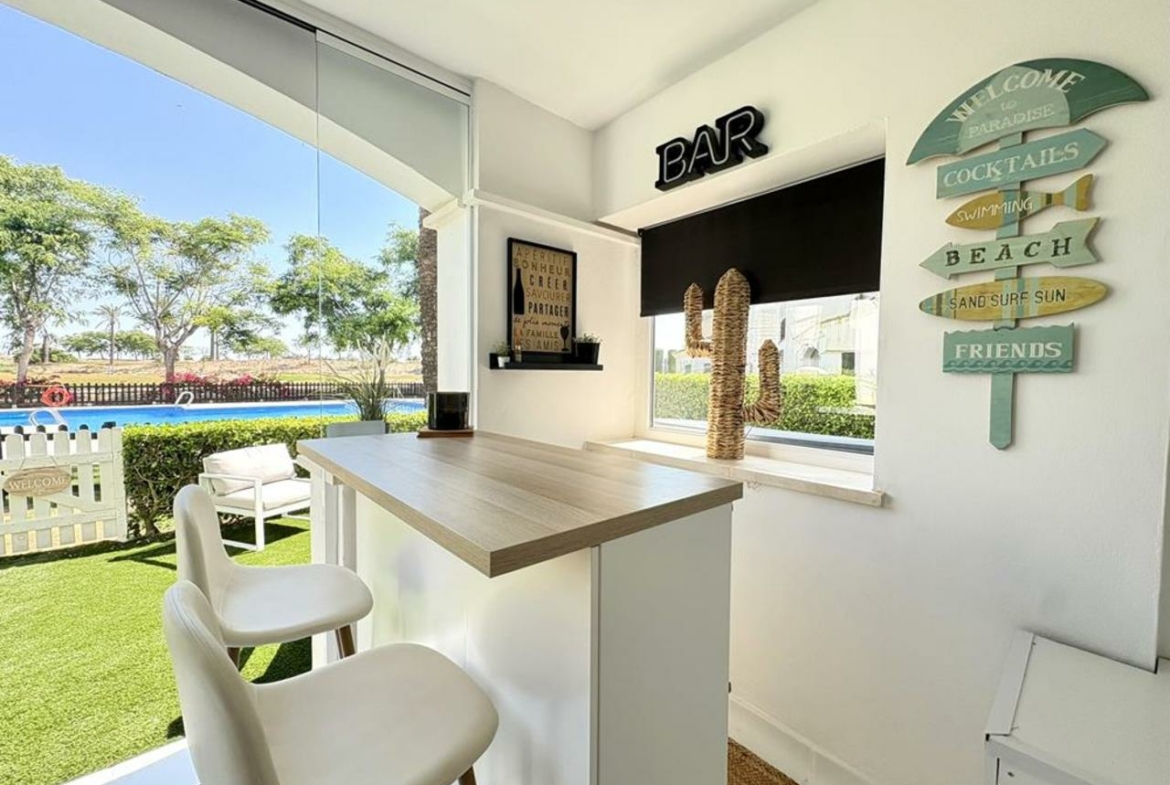 From the lounge, sliding glass doors lead you to a fully enclosed covered terrace, featuring elegant glass curtains. This space is perfect for year-round use, offering a large dining table and a dedicated bar area—ideal for entertaining or simply enjoying a peaceful drink with a view. Beyond the terrace, you’ll find a private garden that opens directly onto the communal pool, with stunning views of both the pool and glimpses of the golf course.