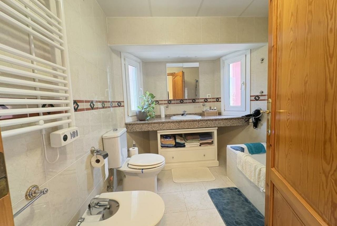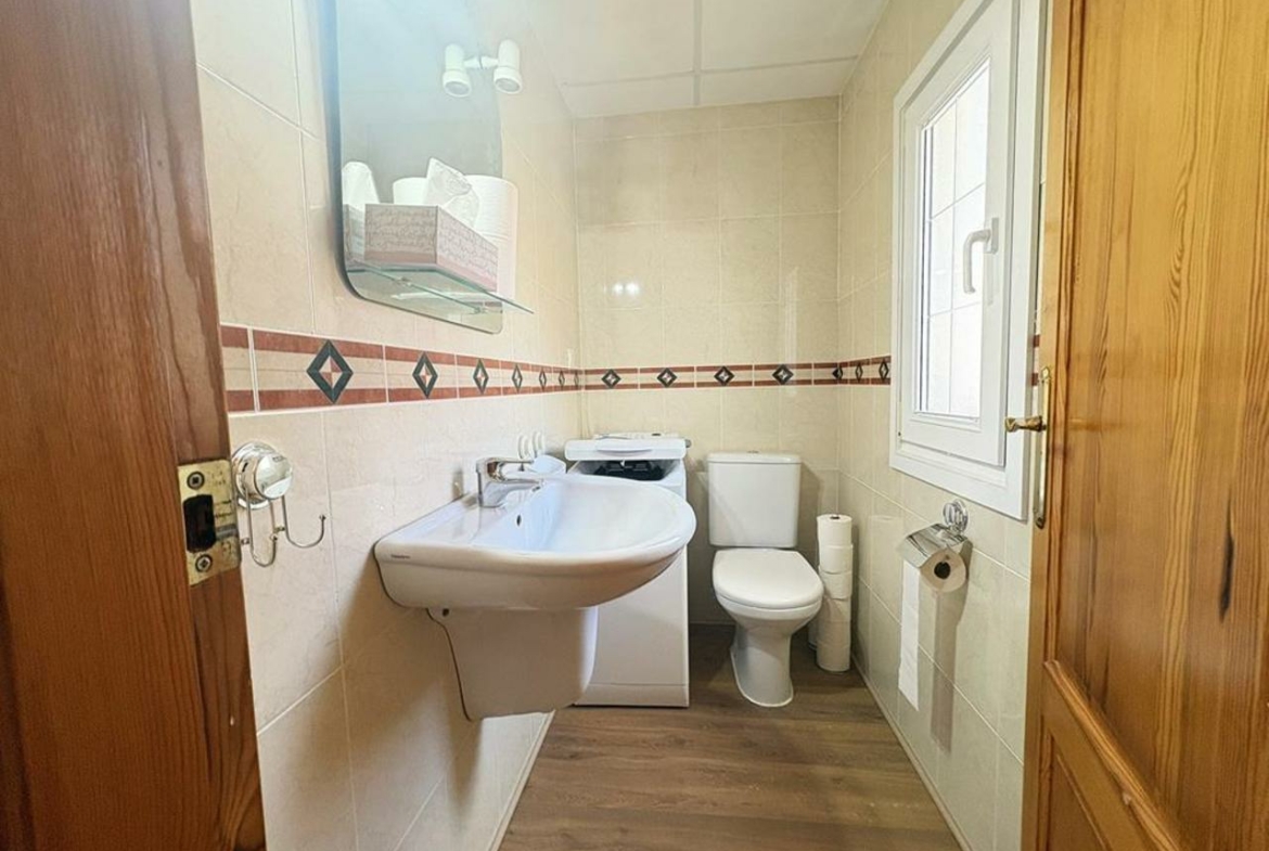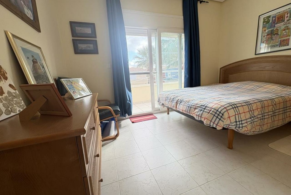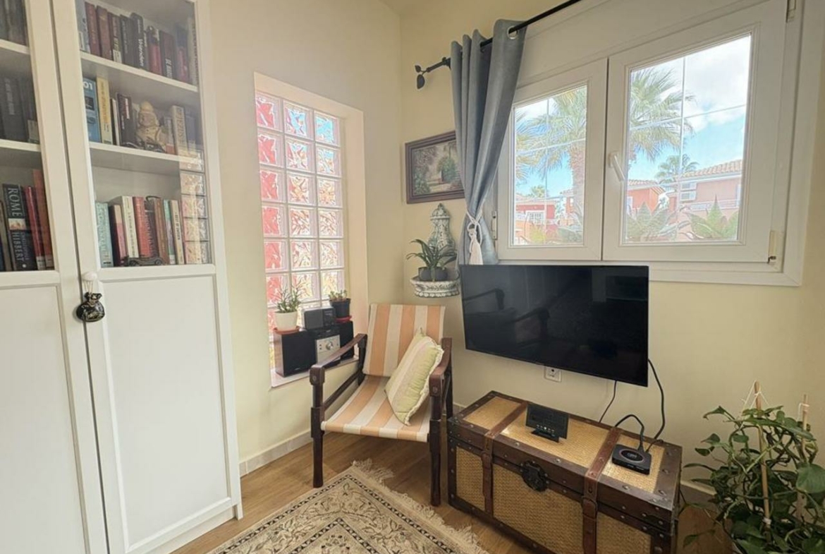 The upper floor comprises two well-sized bedrooms and a complete bathroom. The main bedroom has direct access to a private terrace with open views over the communal areas, making it an ideal spot to relax and enjoy the surroundings.