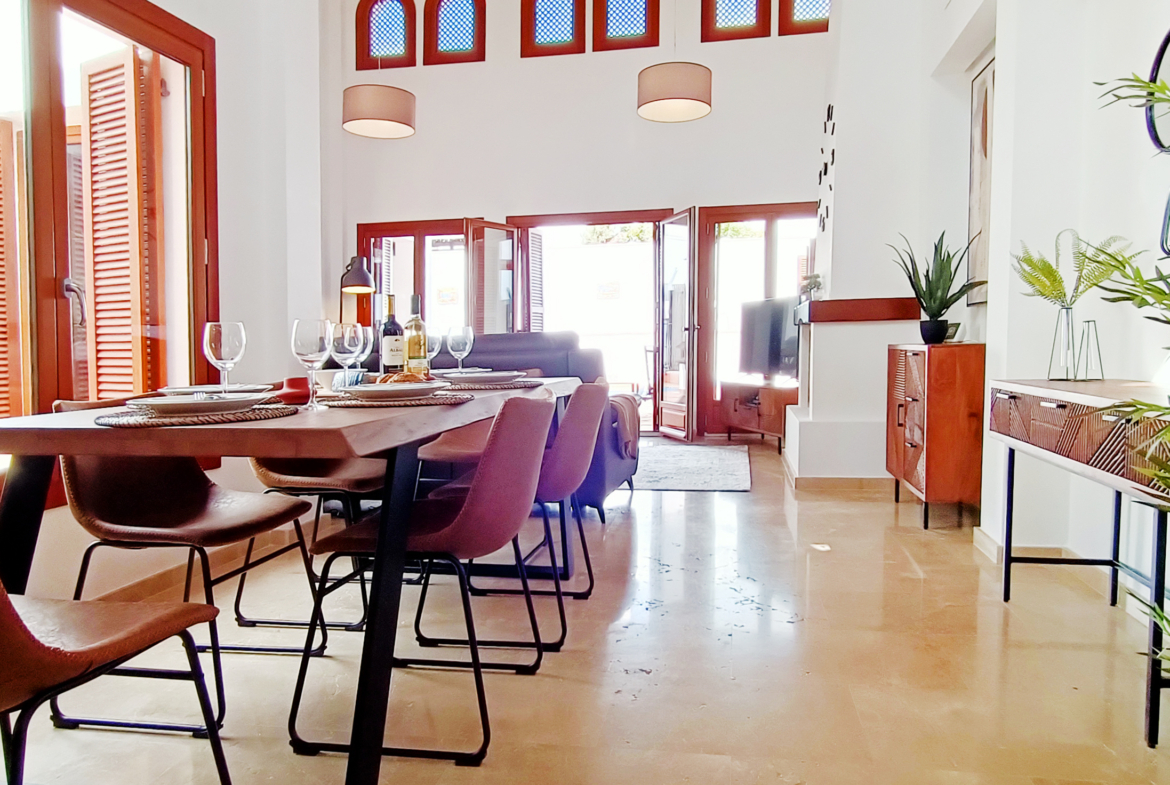 The spacious open-plan living and dining area seamlessly connects to the outdoor terrace and garden, creating an effortless flow between indoor and outdoor living. The patio doors fill the space with sunlight and provide direct access to your private heated swimming pool — perfect for year-round enjoyment.
