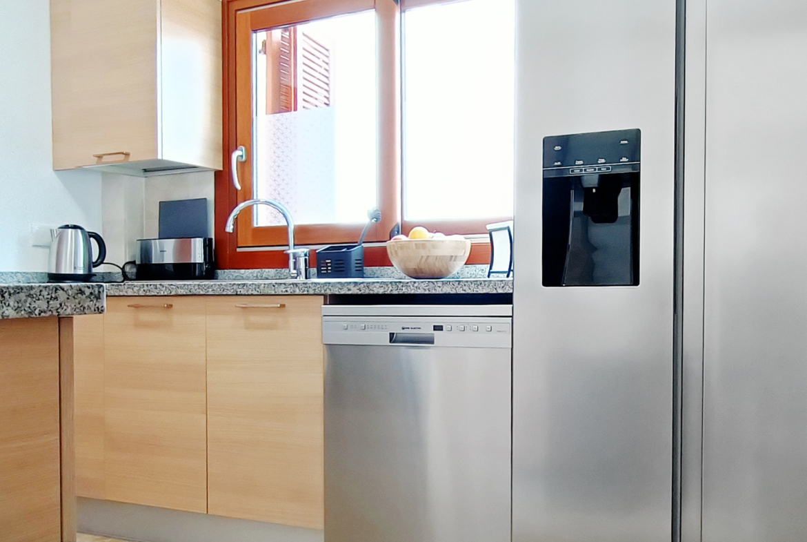 The fully equipped kitchen includes top-quality appliances, ample countertop space, and an open utility area, offering both style and functionality for everyday living.
