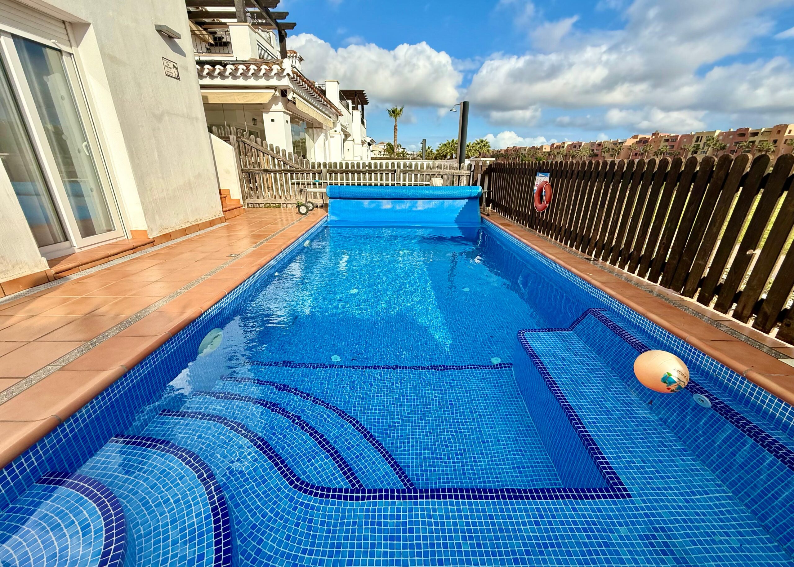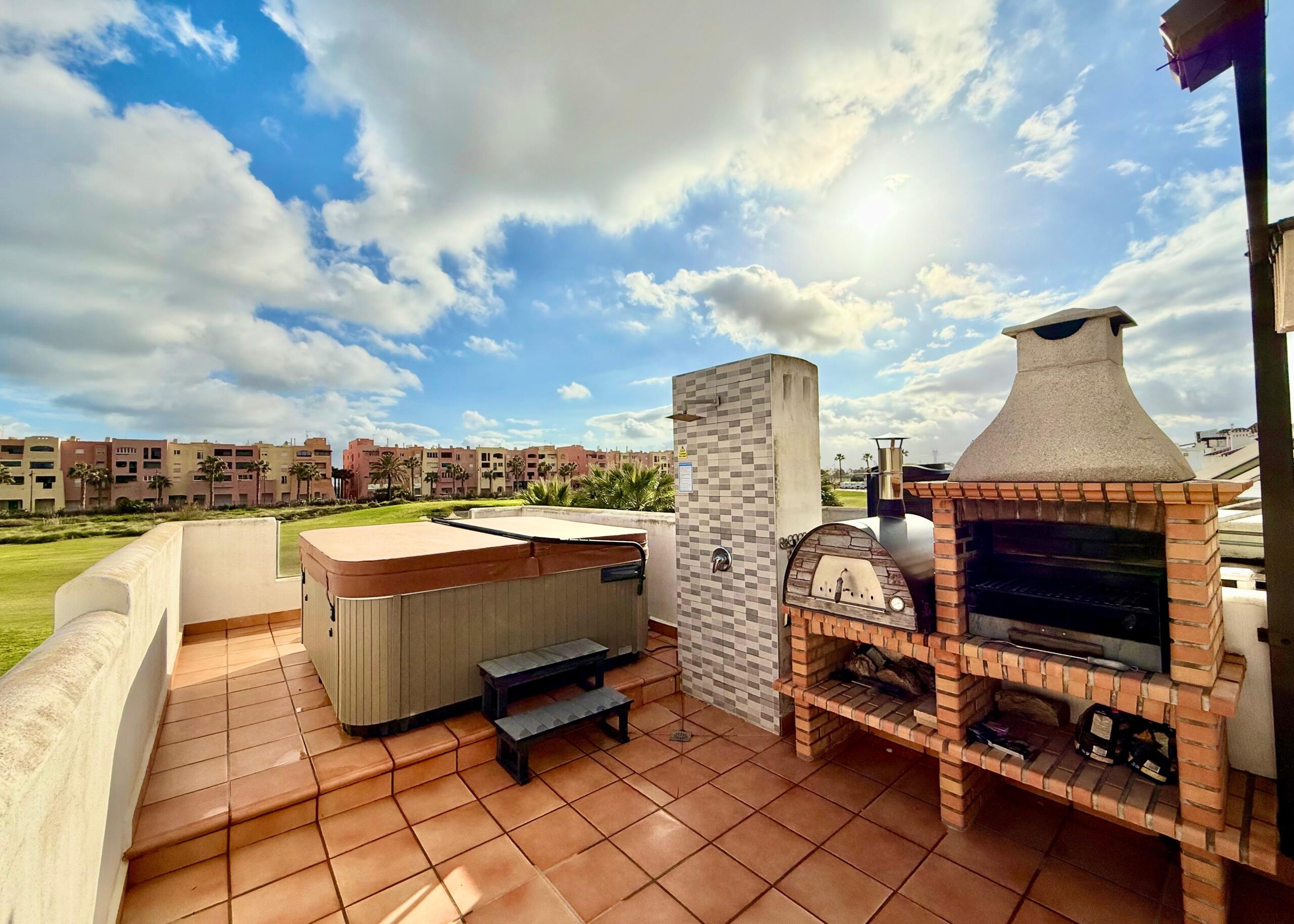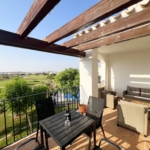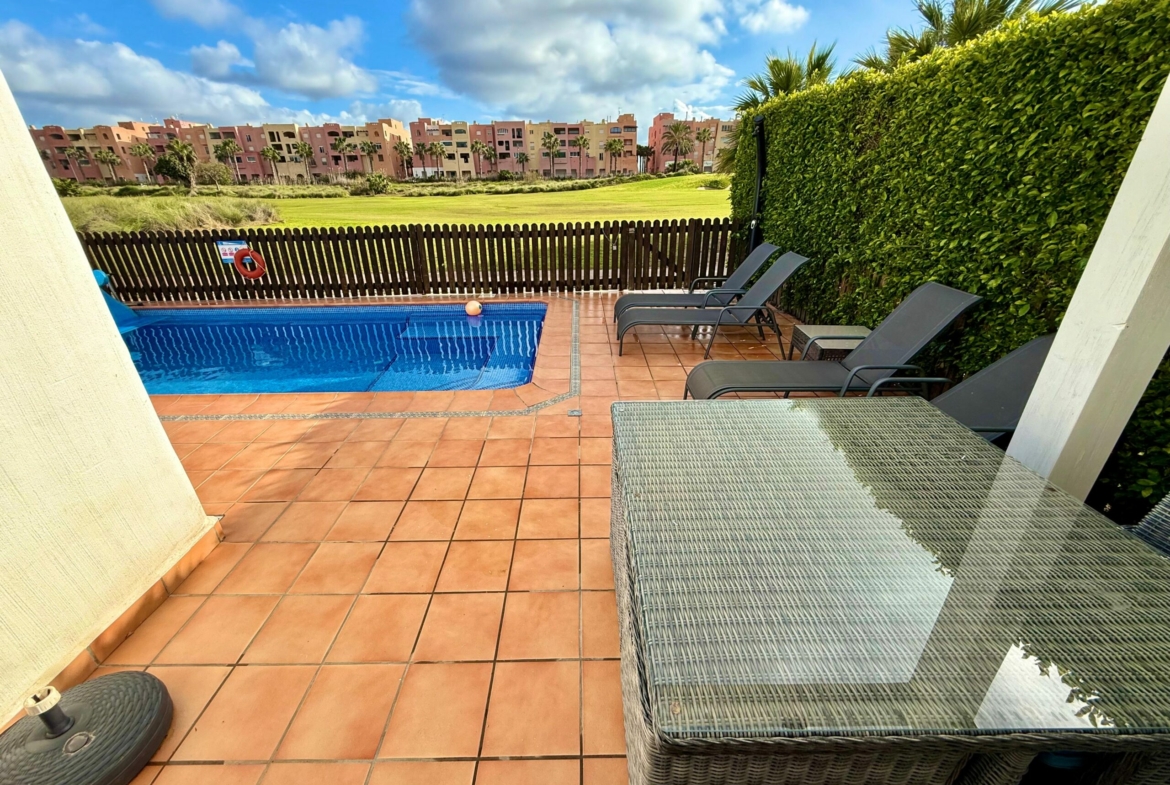 We are excited to offer this amazing three bedroom two bathroom Alba villa with private swimming pool on the Mar Menor Golf Resort. The villa is south facing, is being sold as seen and has a fabulous roof solarium with outdoor kitchen, bbq and jacuzzi, the perfect entertaining space. It has frontline views over the golf course and is only a short walk to the MMGR club with restaurant, padel and mini golf, the supermarket and the numerous bars and restaurants on the Boulevard. The Mar Menor beach town of Los Alcazares is an 8 minutes drive. Onsite you have the Ona hotel and clubhouse.