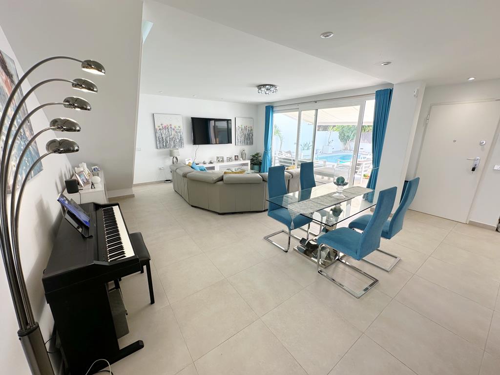 The property is situated in a peaceful location with intercom front gate access or electric sliding gate for off road parking. You enter into the huge front garden with your very own private salt water heated swimming pool. There is a large storage cupboard, outside kitchen and bbq area. There is an electric awning on the front of the property off the lounge. On entering the villa you will find yourself in the huge open plan living, dining and kichen with breakfast bar. The kitchen is fully integrated with bosch appliances and has a separate laundry room. The beautiful sunny lounge diner has patio door access directly to the front garden. There is a separate guest toilet and one downstairs double bedroom with ensuite shower room, walk in wardrobe and access to the office. This room has patio door access to the garden, so perfect for visiting guests. Stairs lead from the rear of the lounge to a further two double suites, both with ensuite shower rooms, walk in wardrobes and patio door access to a huge solarium. Compared to a lot of new build properties this villa is vast, every room is larger than average but there is no compromise on outdoor space. Every room is bright and sunny Please contact us to book a viewing appointment.