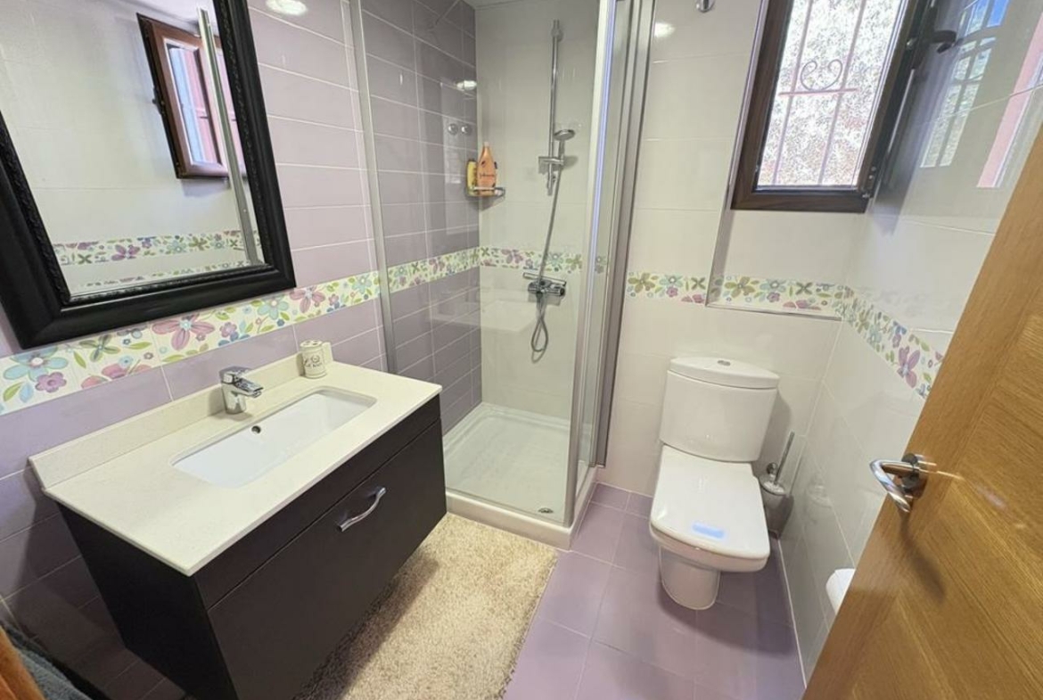 The kitchen is in pristine condition, with high-end finishes and modern appliances. On the ground floor, you’ll find two spacious bedrooms and two bathrooms, one of which is en-suite. Both bedrooms have direct access to the garden through large patio doors, flooding the rooms with natural light and creating a seamless indoor-outdoor flow. There’s also a large storage space under the staircase, ideal for extra organization.