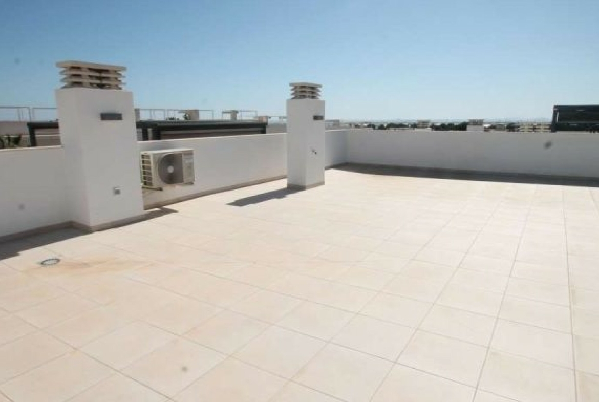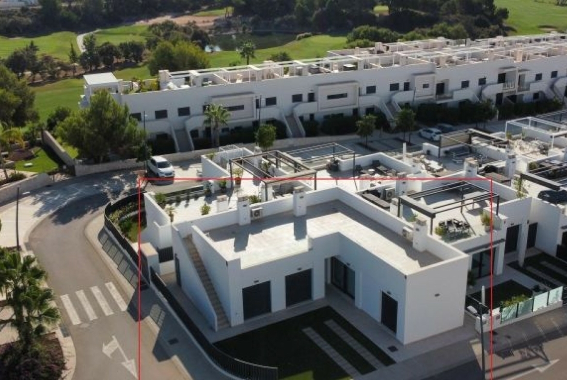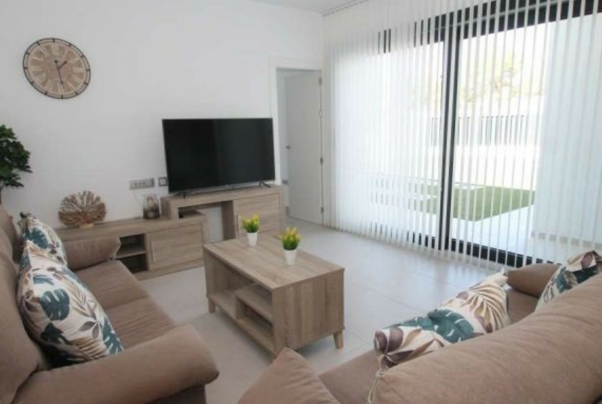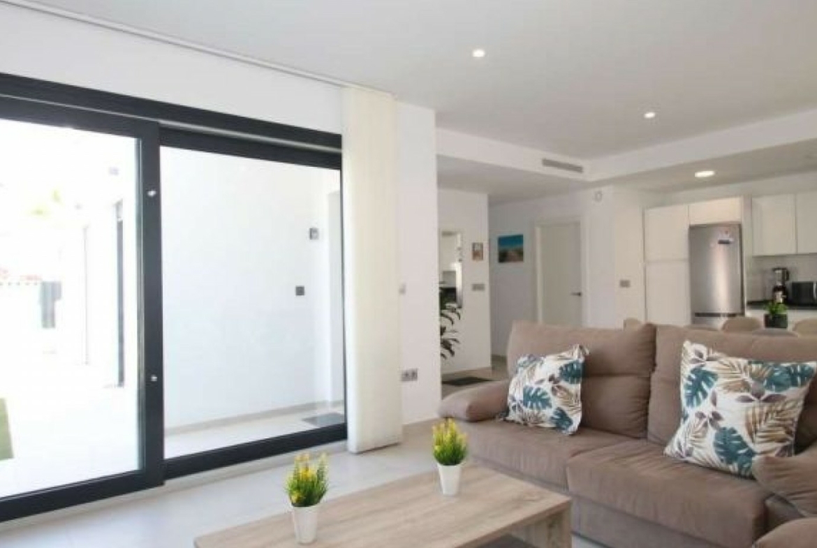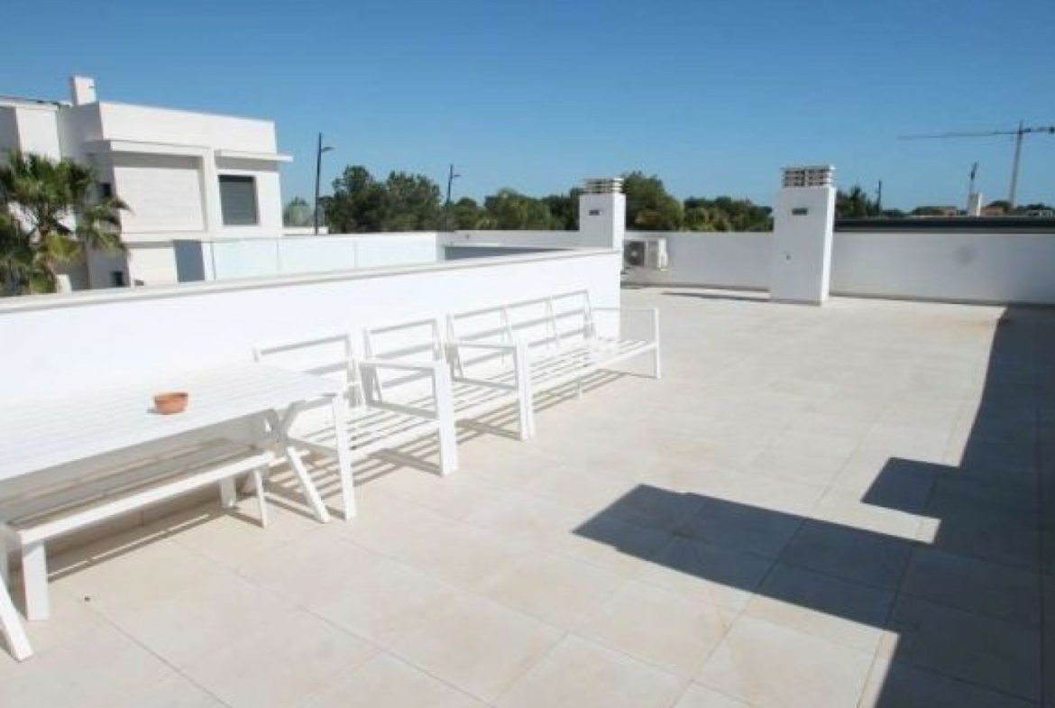 The villa has an open plan living room, three bedrooms, three bathrooms, a garden and roof terrace. The villa is ready to move into now. Offered for sale furnished and with air-conditioning. There is a communal swimming pool across the road, plus space to install a private swimming pool should you wish to.