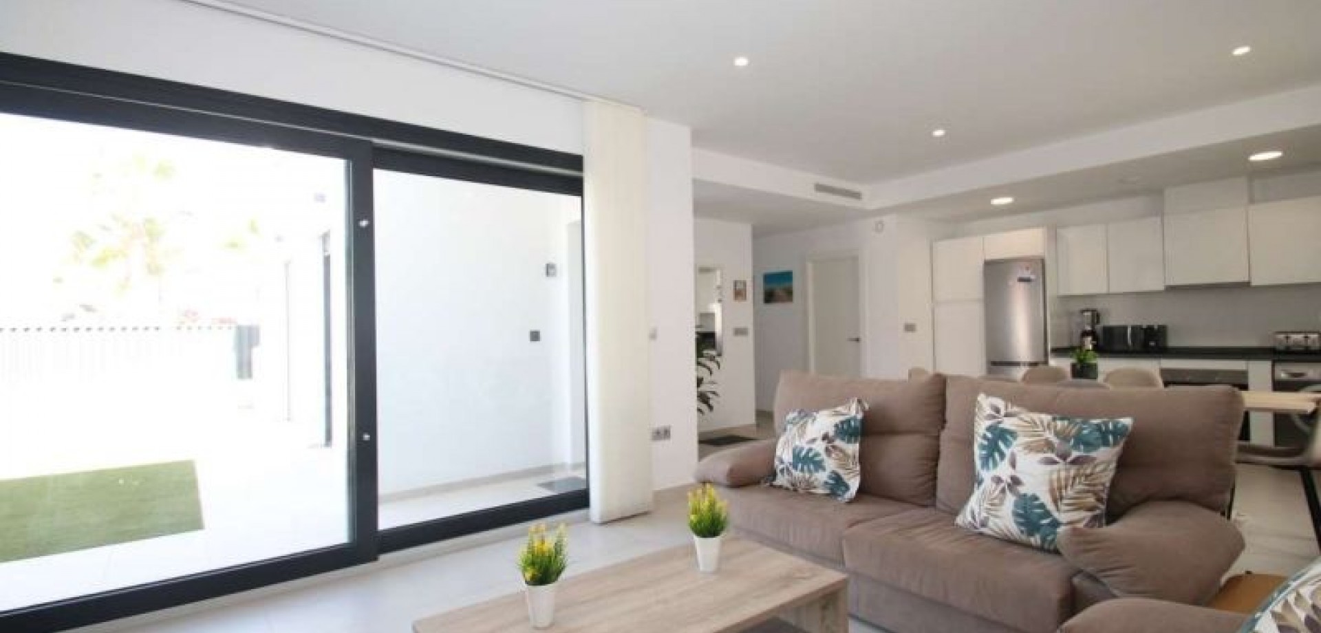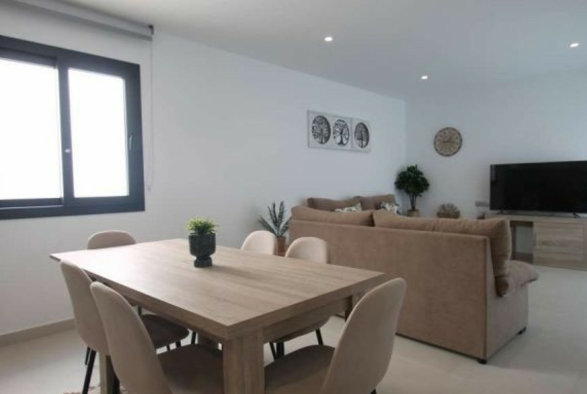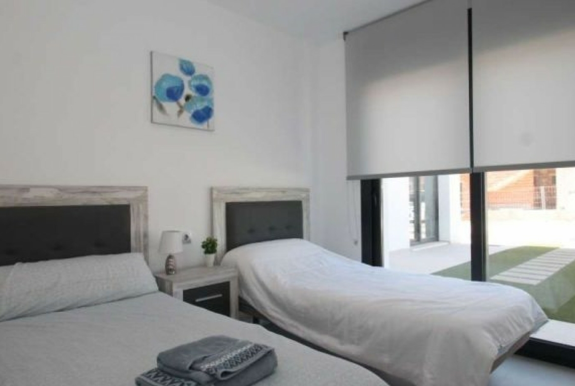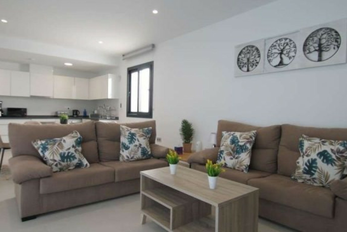 The villa has an open plan living room, three bedrooms, three bathrooms, a garden and roof terrace. The villa is ready to move into now. Offered for sale furnished and with air-conditioning. There is a communal swimming pool across the road, plus space to install a private swimming pool should you wish to.