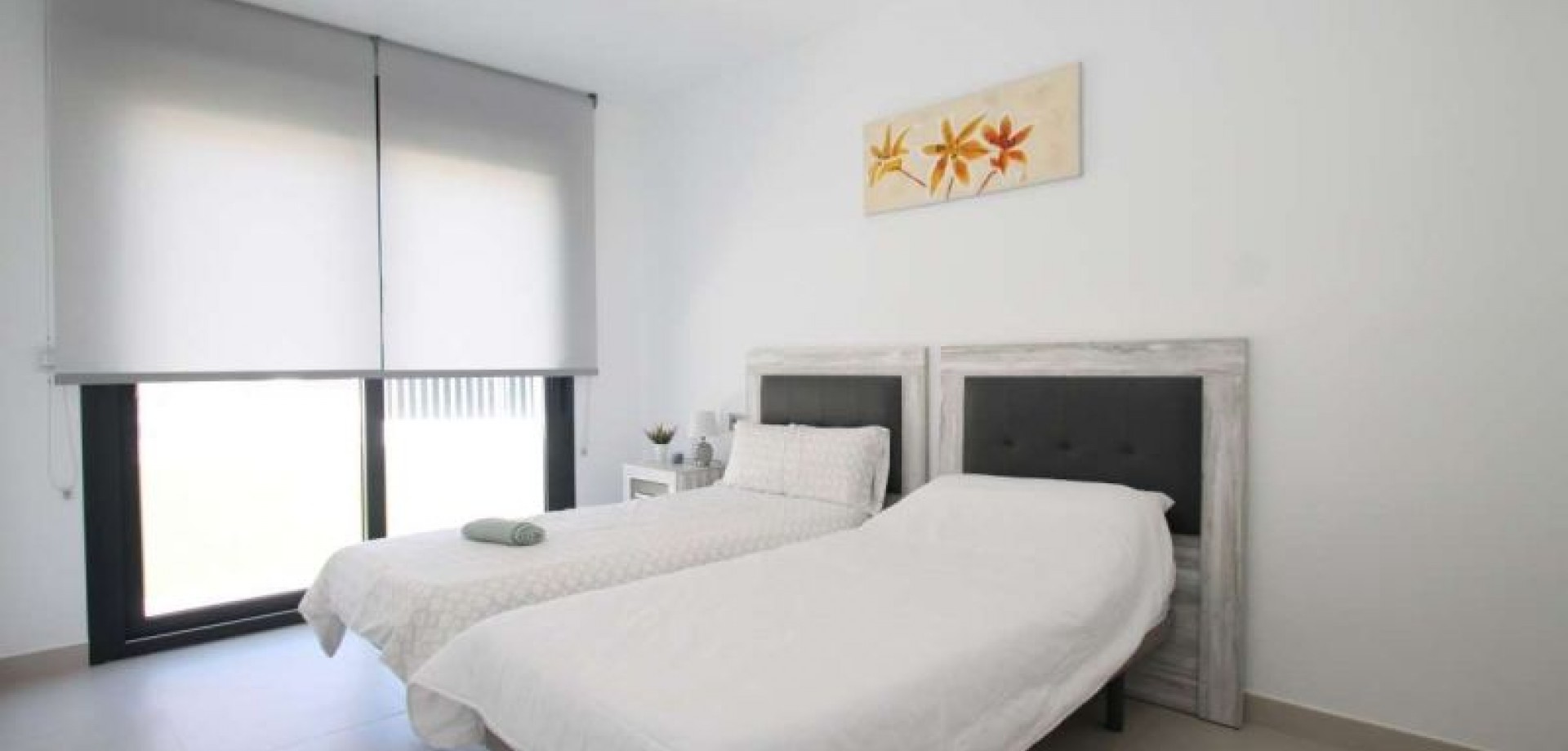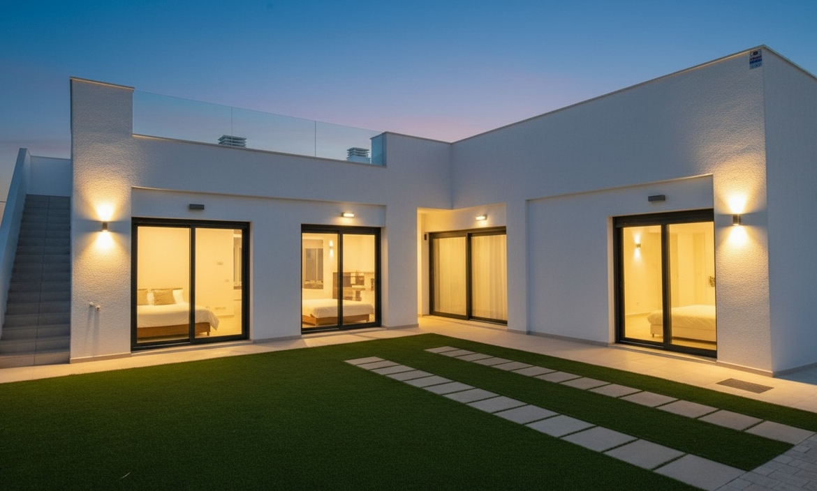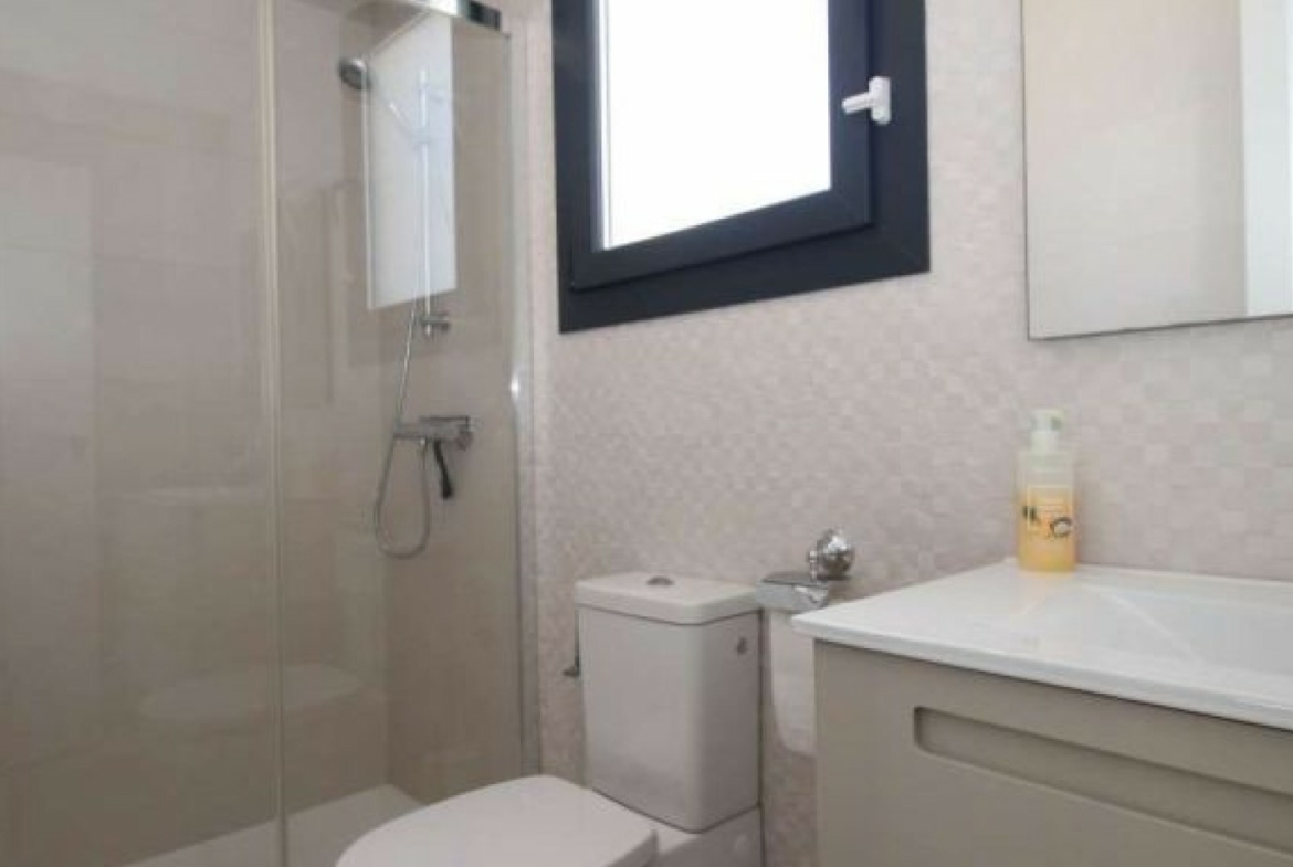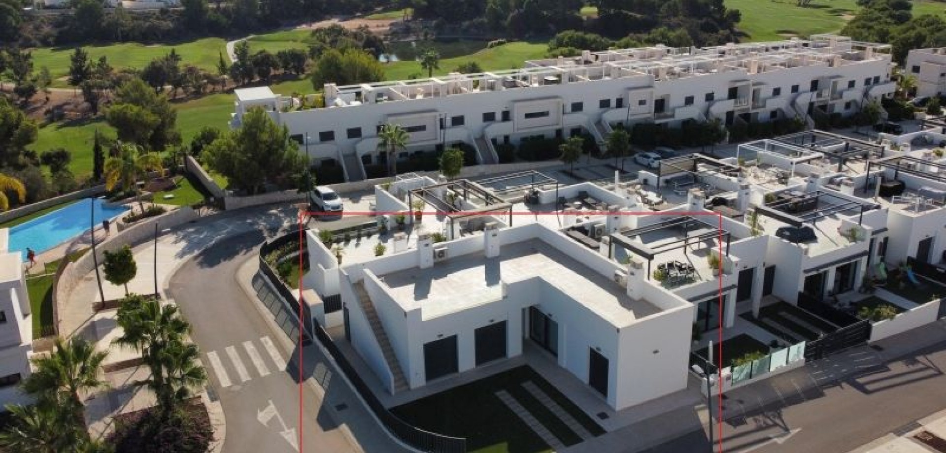 The villa has an open plan living room, three bedrooms, three bathrooms, a garden and roof terrace. The villa is ready to move into now. Offered for sale furnished and with air-conditioning. There is a communal swimming pool across the road, plus space to install a private swimming pool should you wish to.