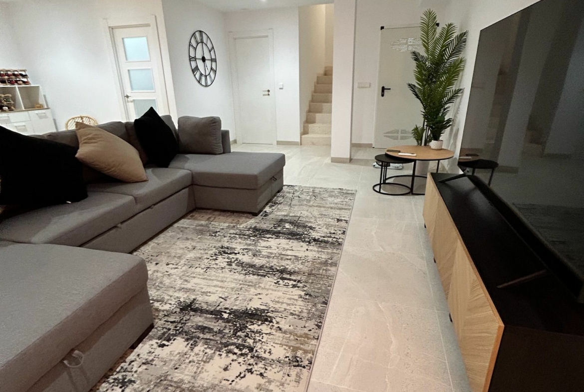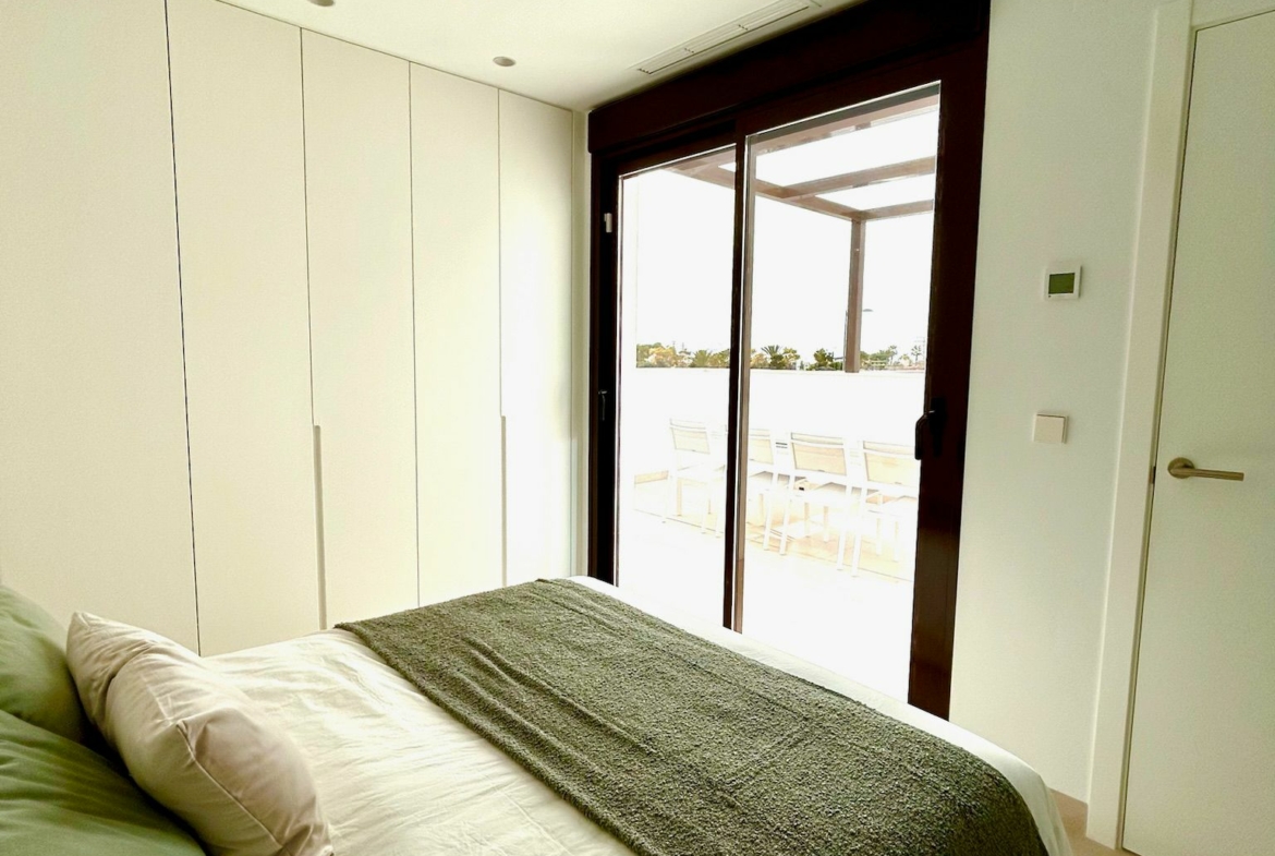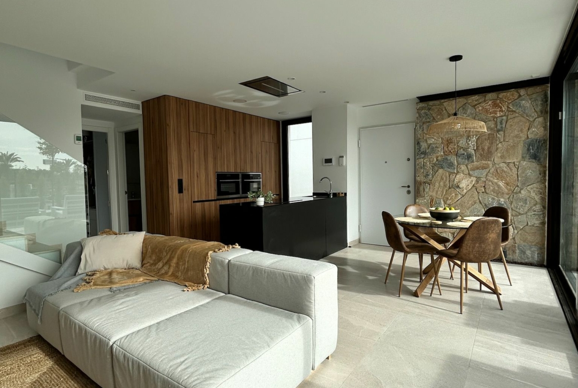 The villa is beautifully presented and furnished to the highest standard, all of which is included in the sale. The ground floor comprises an open plan living room and contemporary kitchen and built-in appliances. Sliding doors open into the garden which features sun bathing areas, an outdoor shower and a private swimming pool. Also on the ground floor is a double bedroom with fitted wardrobes and a bathroom.