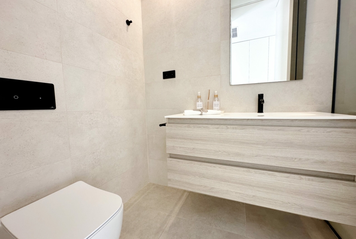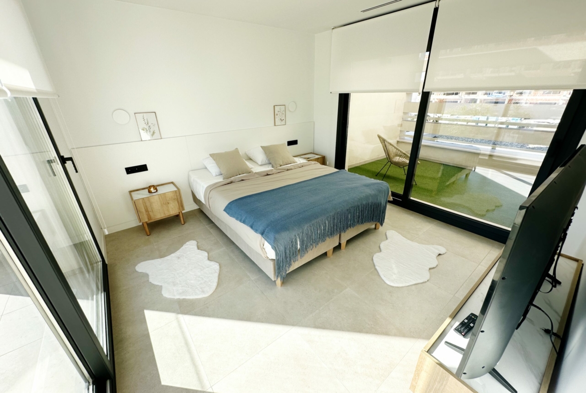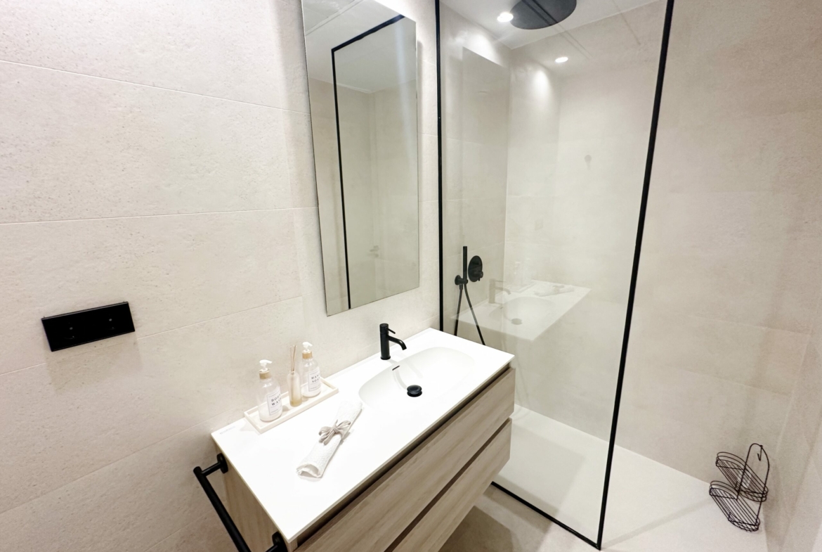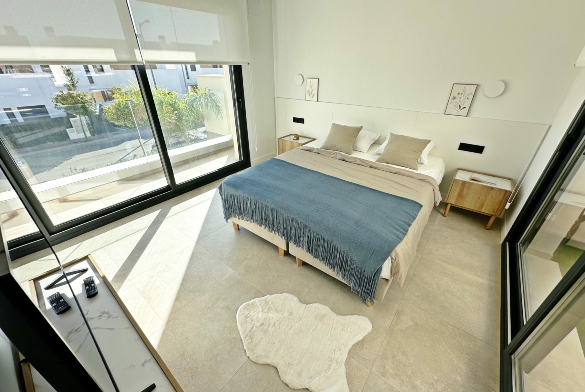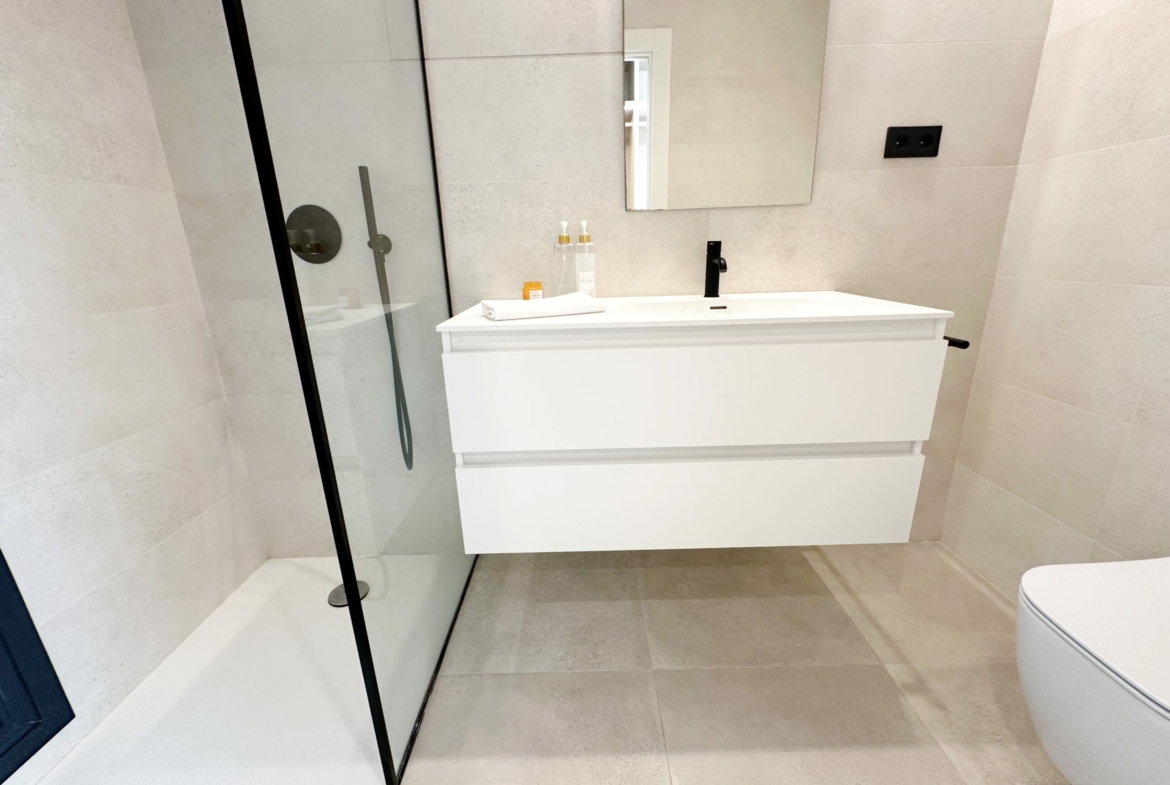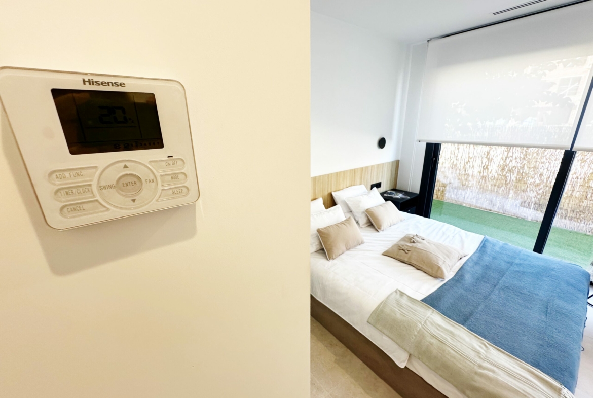The property is sold fully furnished, has an A-class energy rating, Airzone climate control, an outdoor shower in the garden, and the option for quick completion – with no need to wait for a new construction phase.