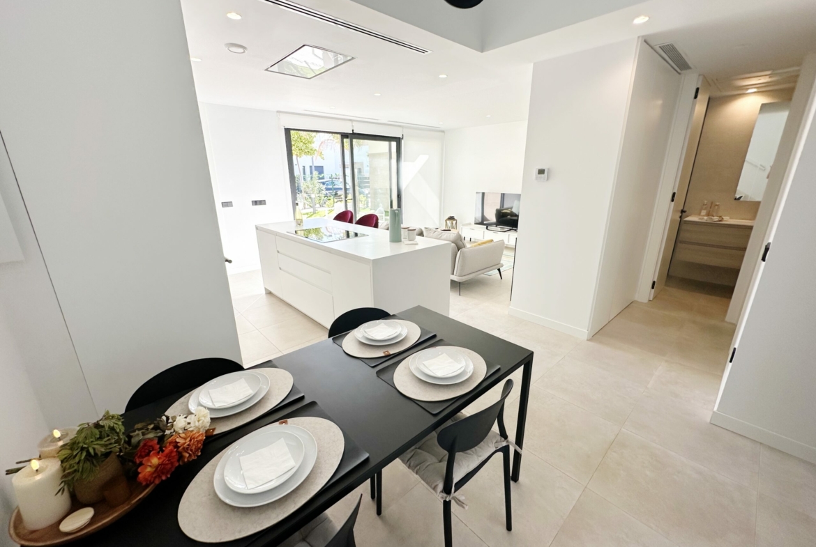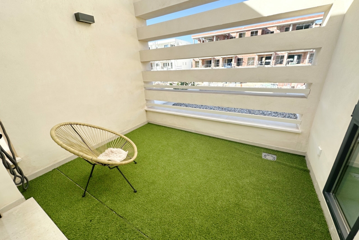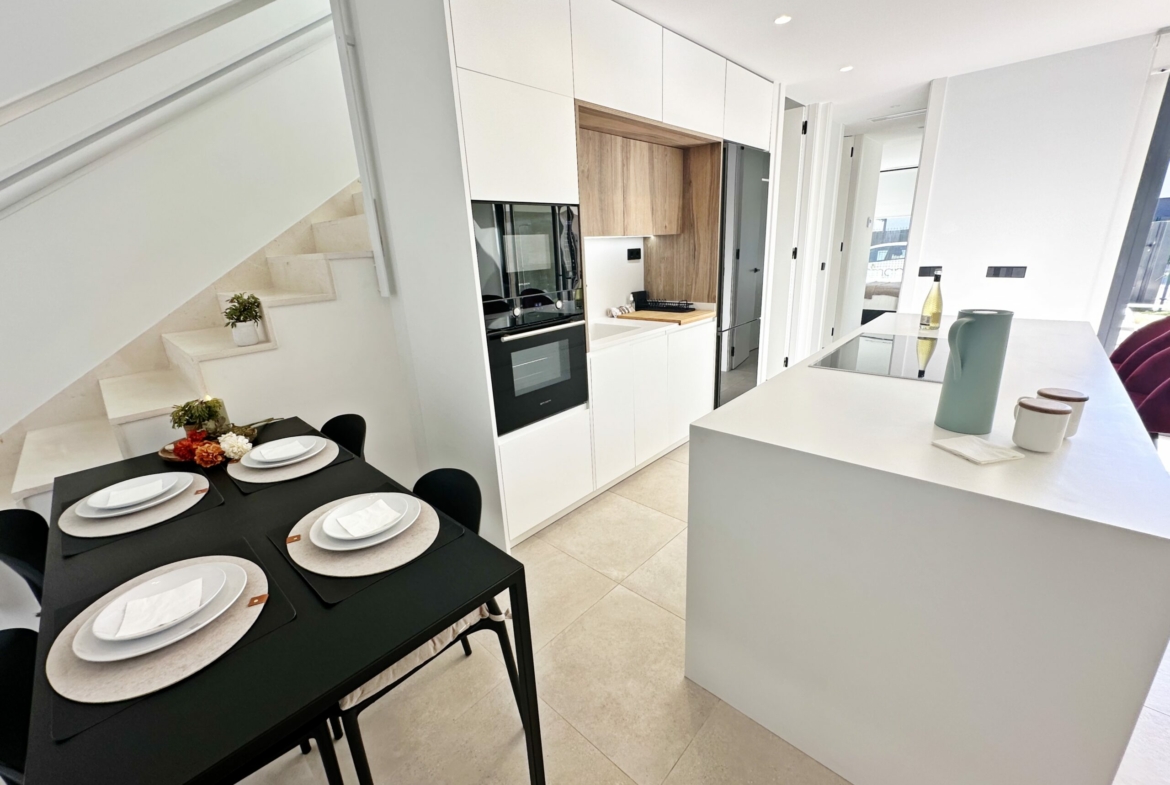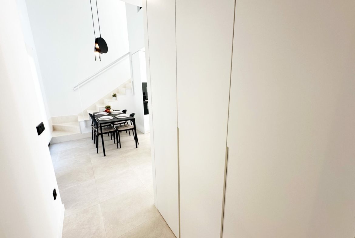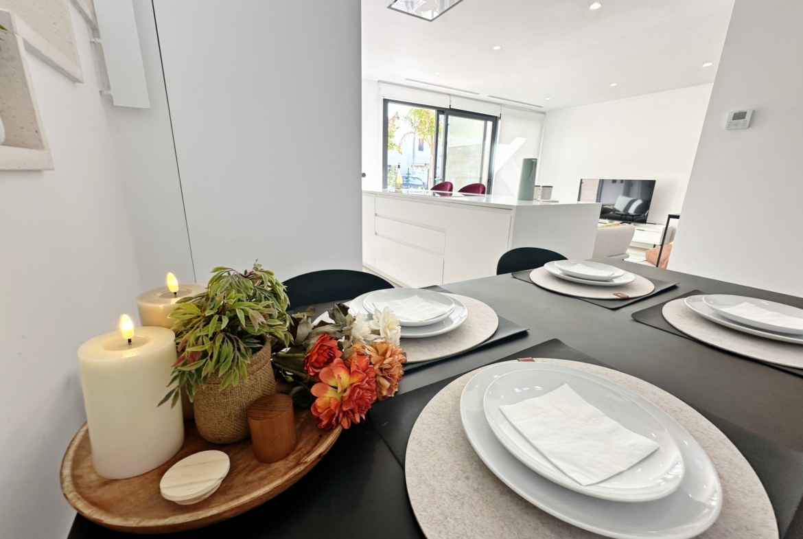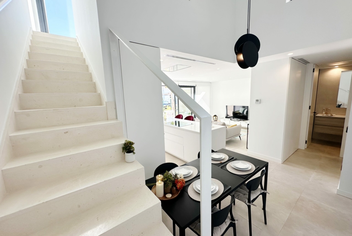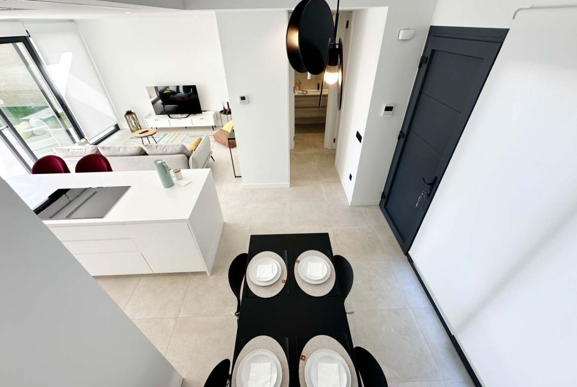 The property is sold fully furnished, has an A-class energy rating, Airzone climate control, an outdoor shower in the garden, and the option for quick completion – with no need to wait for a new construction phase.