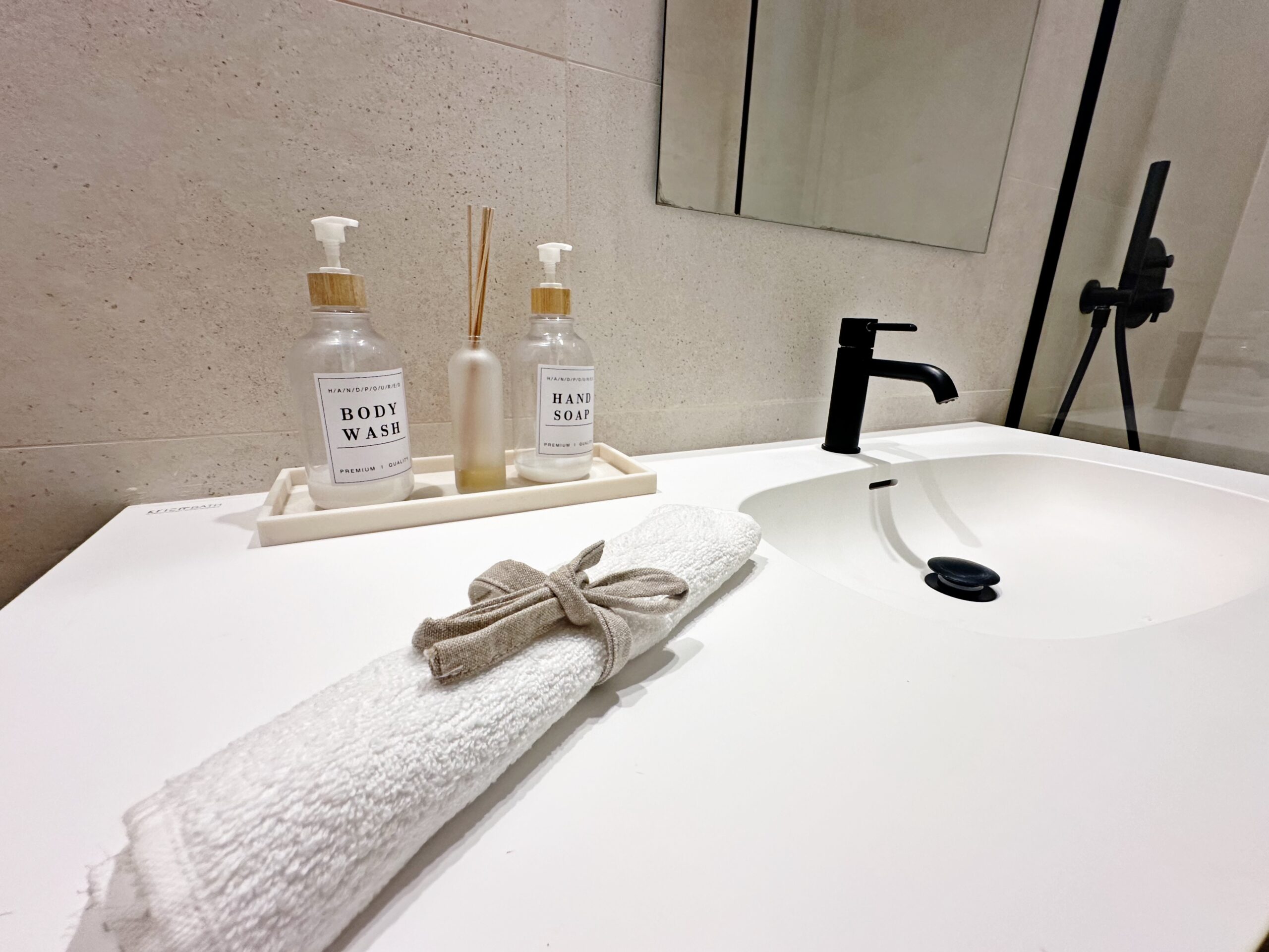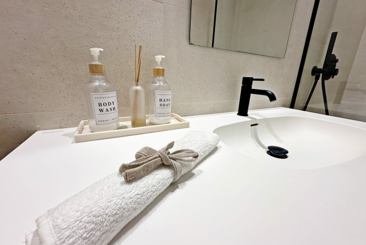 The interior has been carefully arranged with attention to material consistency and fine details. Wall-mounted lights in the bedrooms and the living-room pendant lamp were added at the owners’ request, reflecting a modern Spanish style with a subtly raw, stone-inspired character – resulting in a balanced and elegant atmosphere throughout.