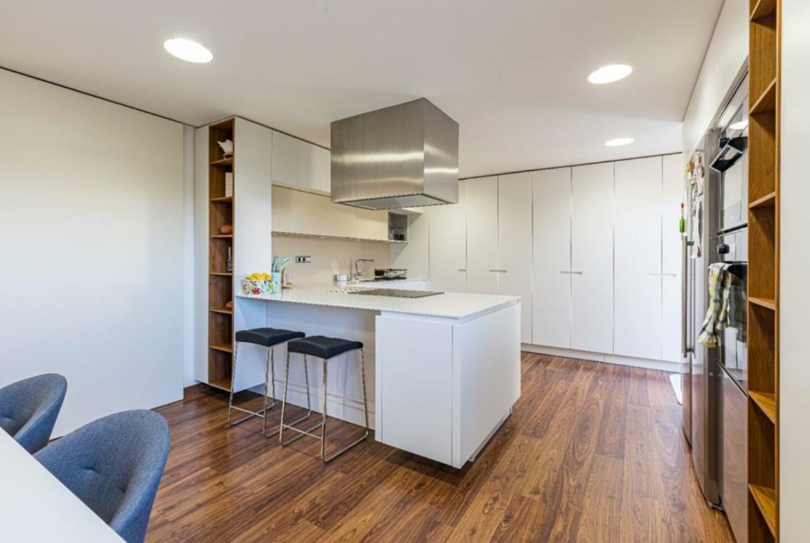 The first floor is accessed from the upper floor by stairs or lift and from the garden and pool area. Spacious living room, all glazed, elegant, minimalist and at the same time cosy. Fully equipped kitchen, with access to an outdoor patio, ideal for breakfasts. This floor also has a complete bathroom.