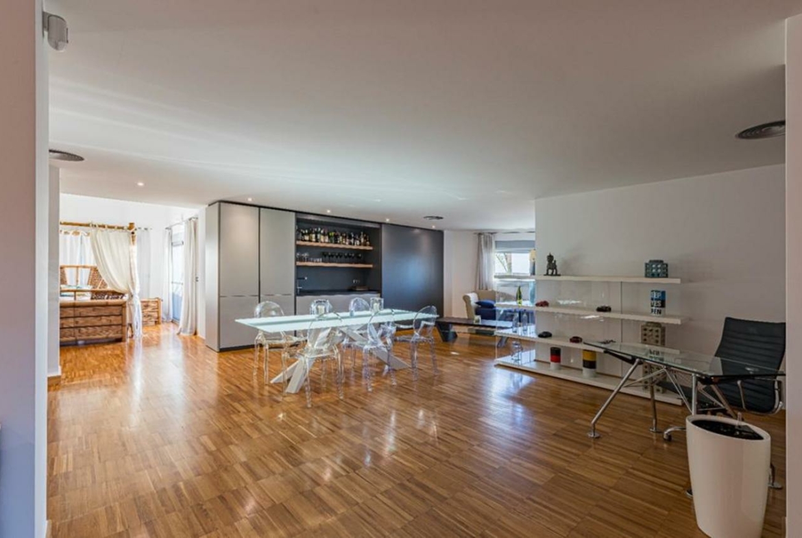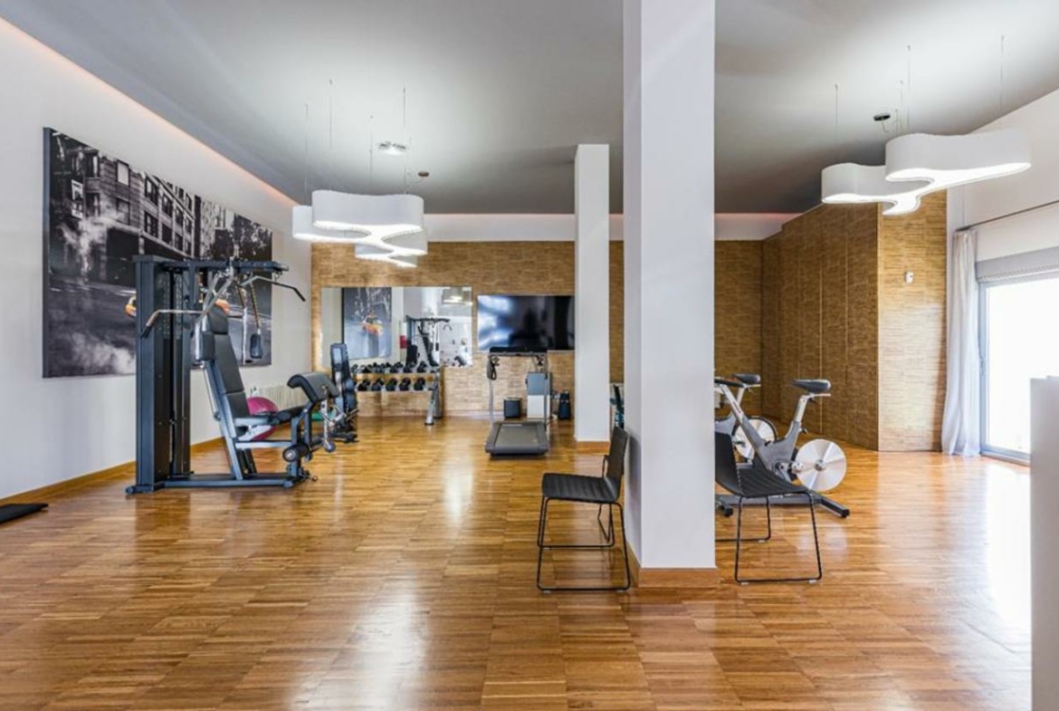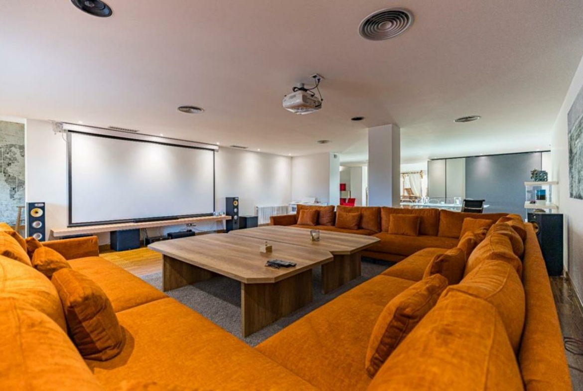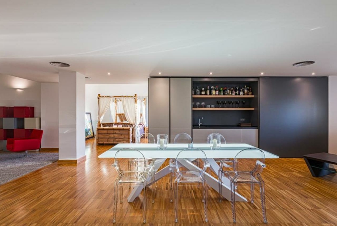 The ground floor, which again is reached from the garden and by stairs or lift, is simply extraordinary; 300m2 of games area, gymnasium, cinema, kitchen/dining room, bedroom and bathroom; surrounded by sliding doors with access to an outdoor terrace with garden, lots of light.