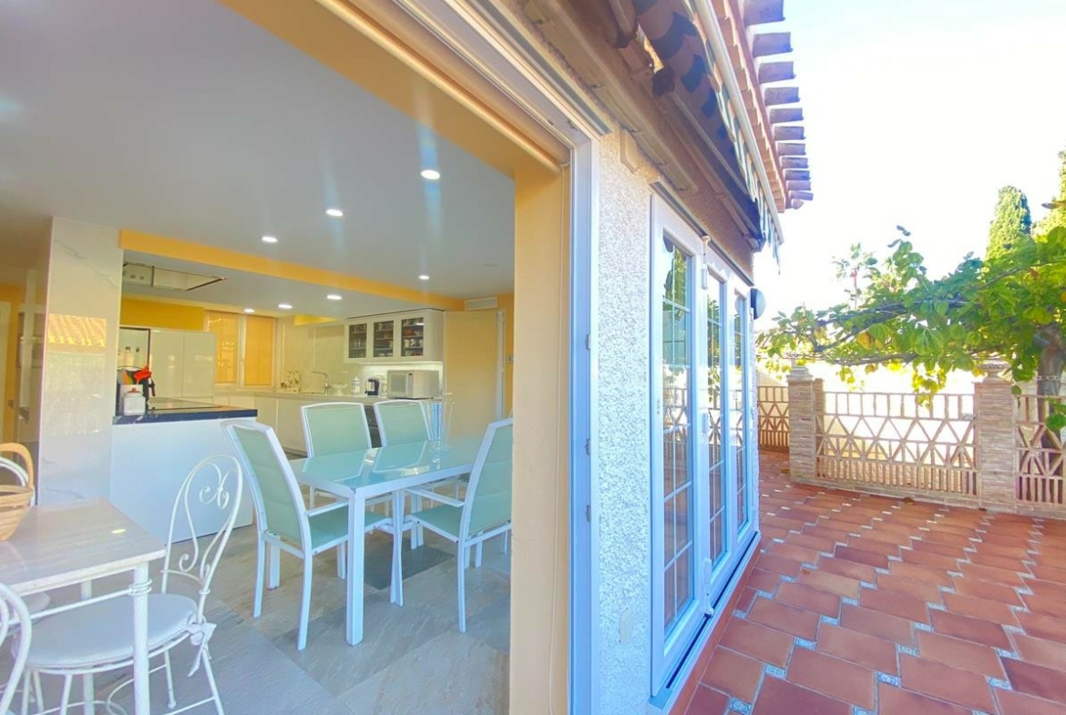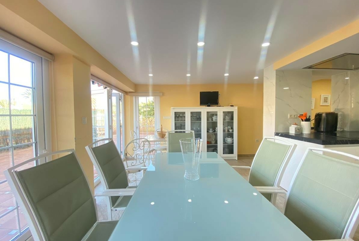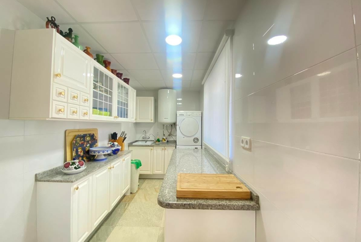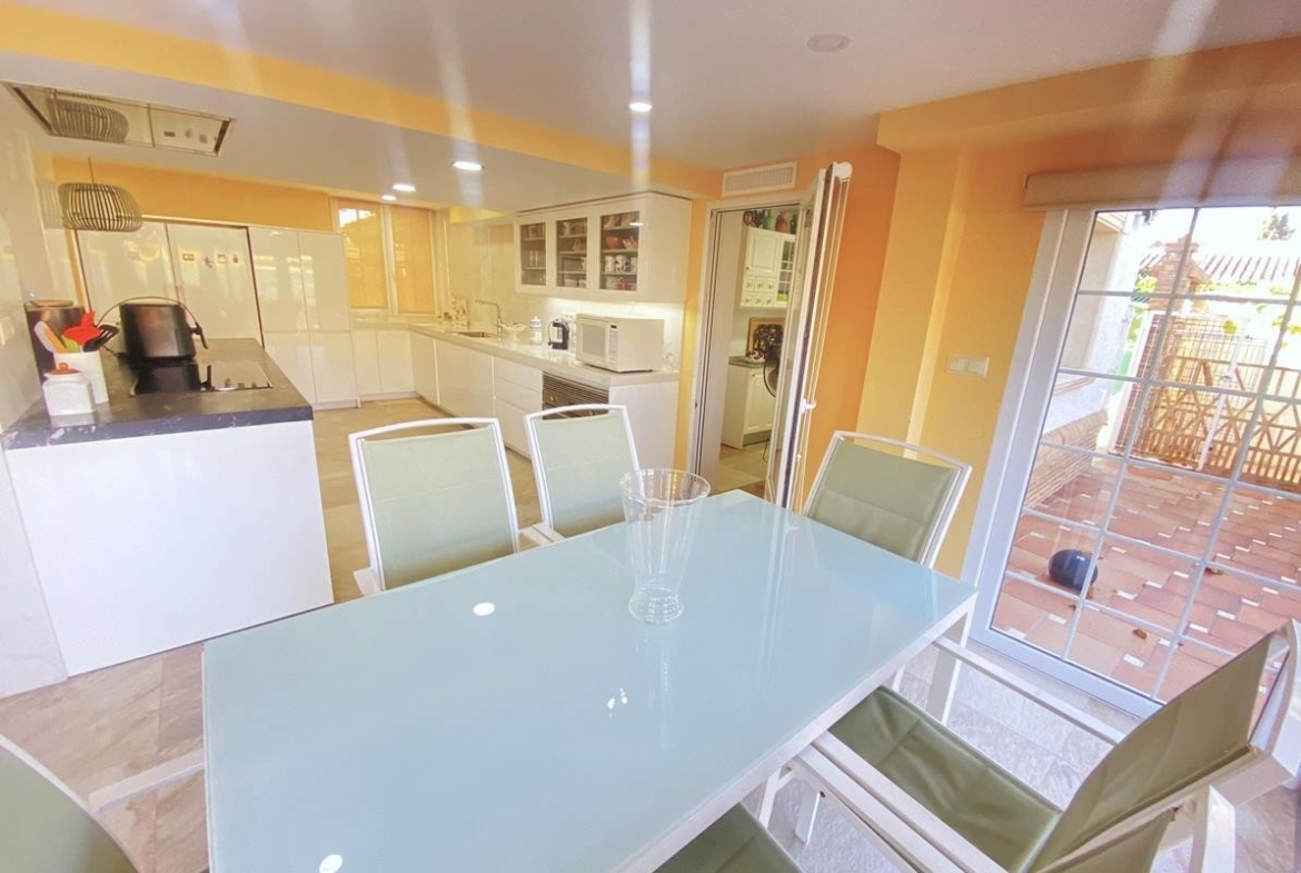 The fully renovated kitchen is another of the main attractions of this villa. With a modern and functional design, it features a large central island, plenty of storage space and a dining area. In addition, from the kitchen there is access to a large back patio, ideal for al fresco dining, as well as a pantry and the private garage.