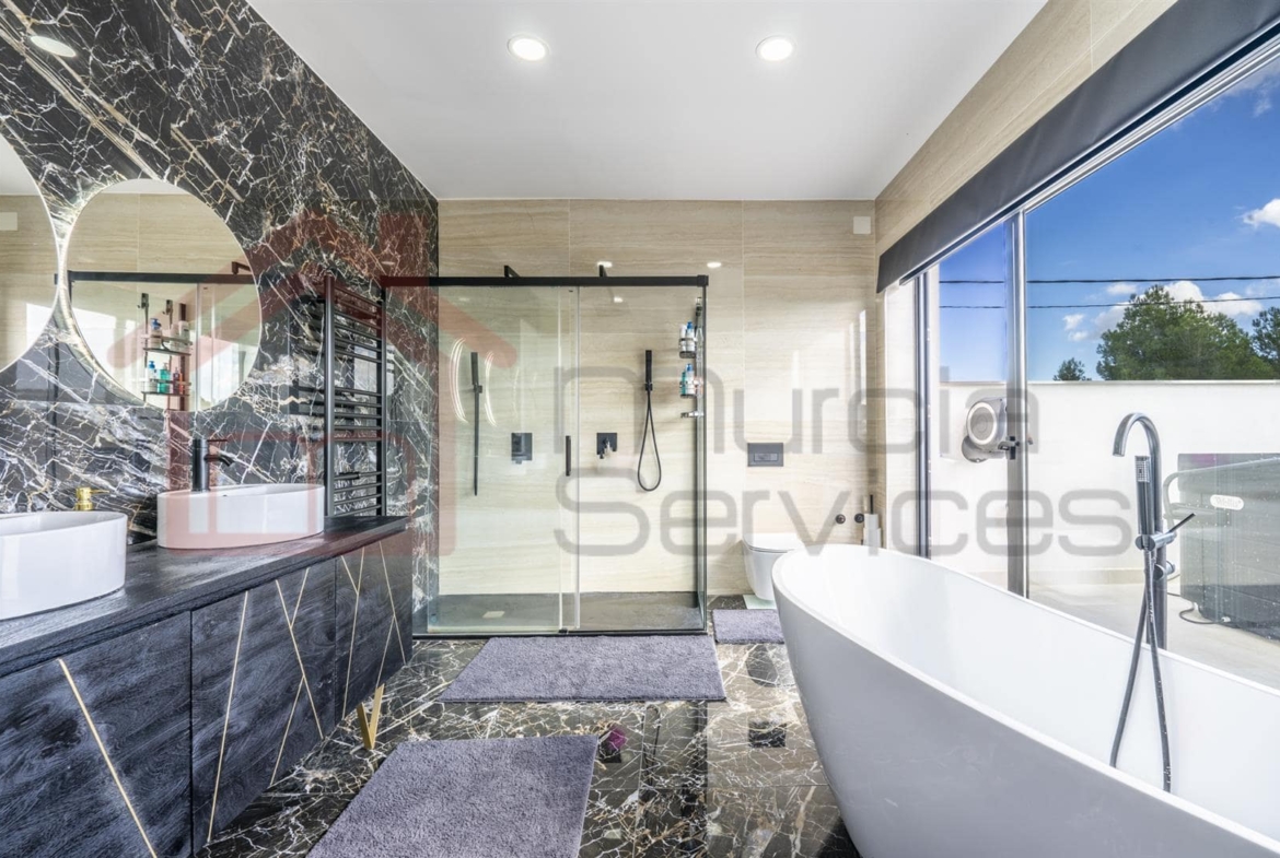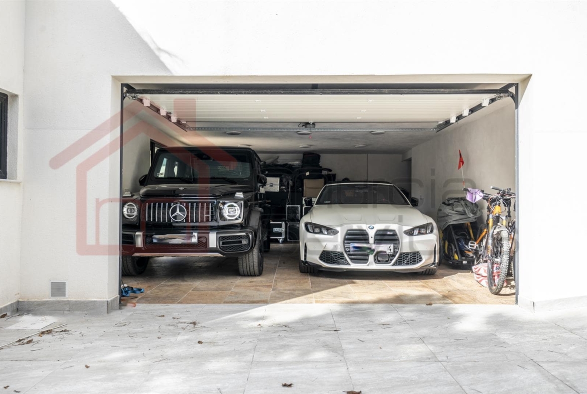 Outdoors, enjoy the perfect balance of relaxation and entertainment. A temperature controlled infinity pool and jacuzzi with a saltwater system, lush landscaped gardens,- and ample terraces ideal for dining and sunbathing.Sustainability meets luxury with solar panels powering the villa, ensuring energy efficiency throughout the year. The temperature-controlled double garage offers secure parking for two cars.The property comes fully furnished, with premium finishes and modern décor that complement its sleek architectural design