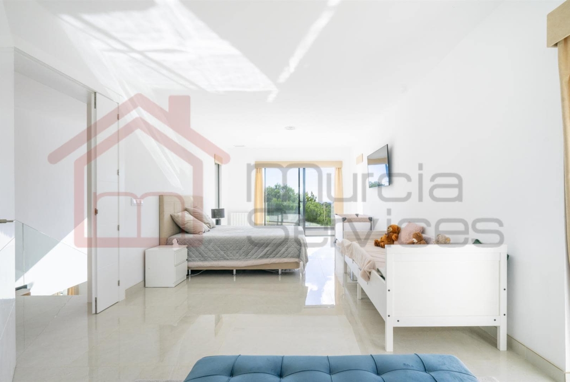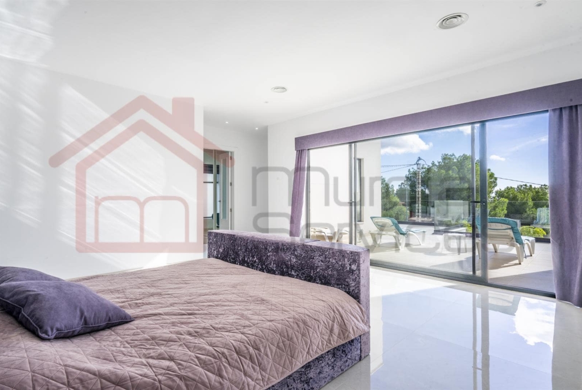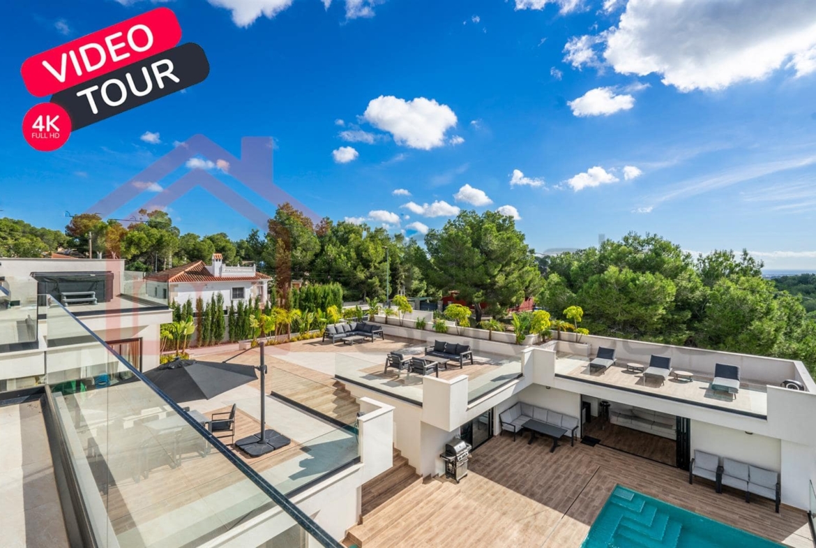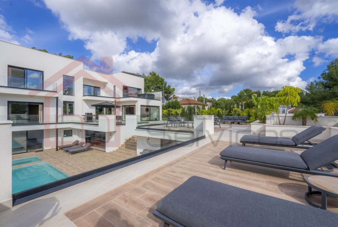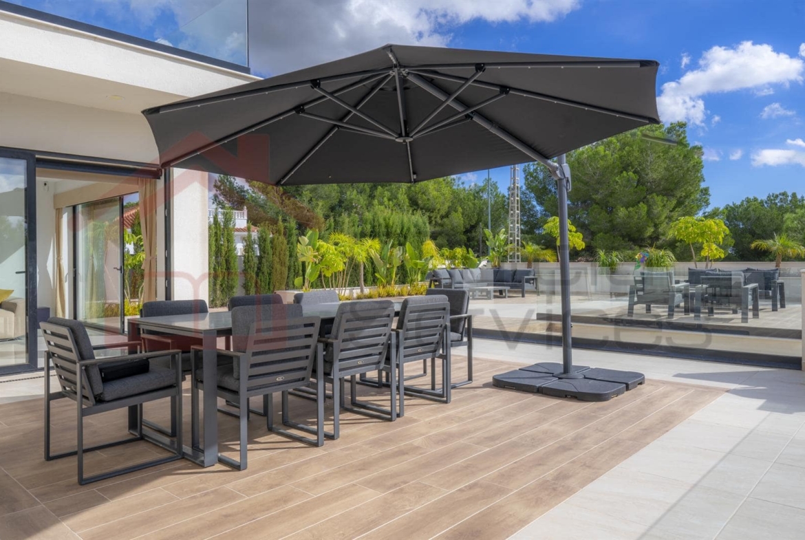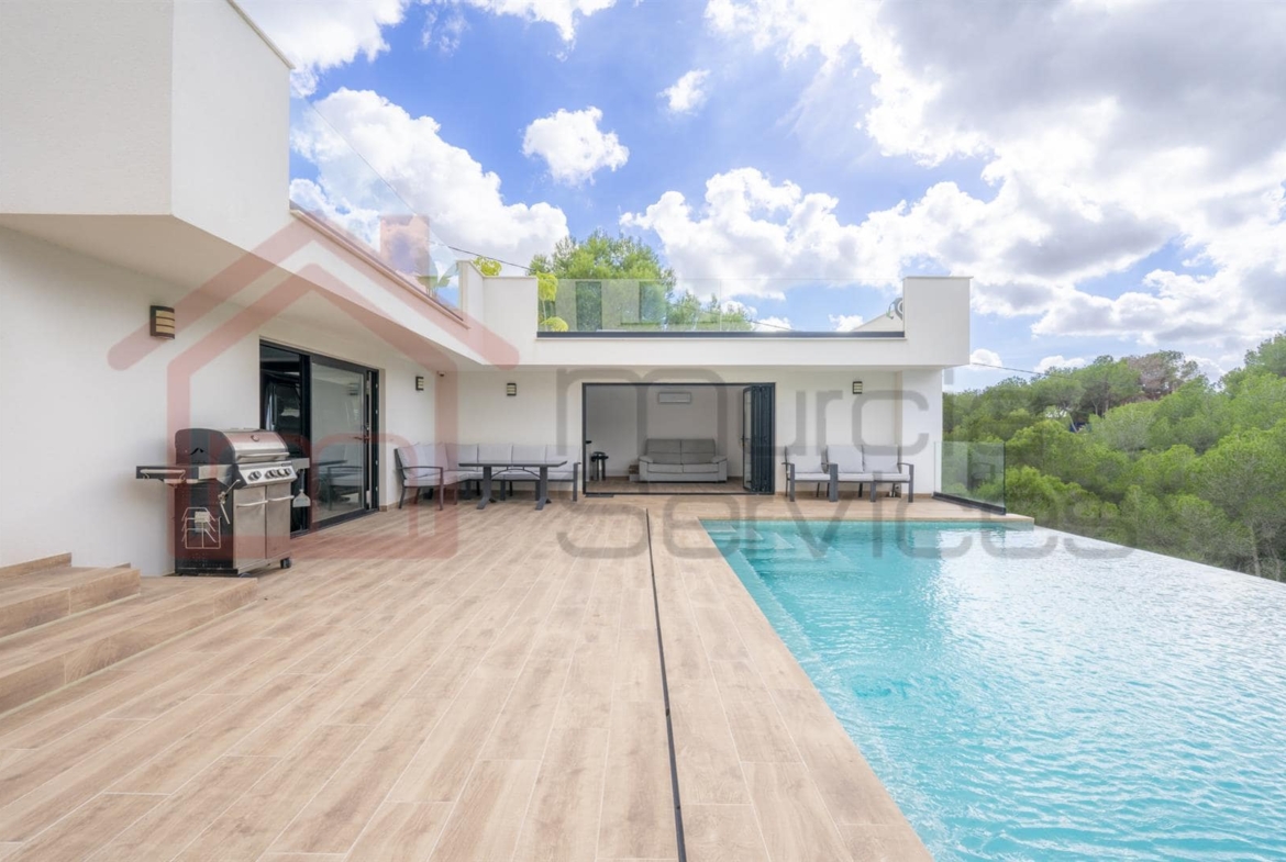 Experience contemporary Mediterranean living at its finest in this stunning five-bedroom, five-bathroom property, perfectly positioned overlooking. The incredible pine trees in the sought-after area of Pinar de Campoverde. The main villa consists of 3 large bedrooms, all en-suite along with an open plan kitchen living area and separate snug tv room.There are two guest areas leading to the infinity pool. One is a self-contained apartment with a separate bedroom, en-suite, kitchen, and living area. And the other being a pool side kitchen, living room and utility area.Built in 2022 and refurbished in 2024, this exceptional property spans 650 m² on a generous 2,000 m² south-facing plot, offering unparalleled comfort, privacy, and smart-living sophistication.Step inside to experience a seamless blend of style and innovation. The villa fully automates lighting, curtains, temperature, and security (including CCTV) through a state-of-the-art smart home system.