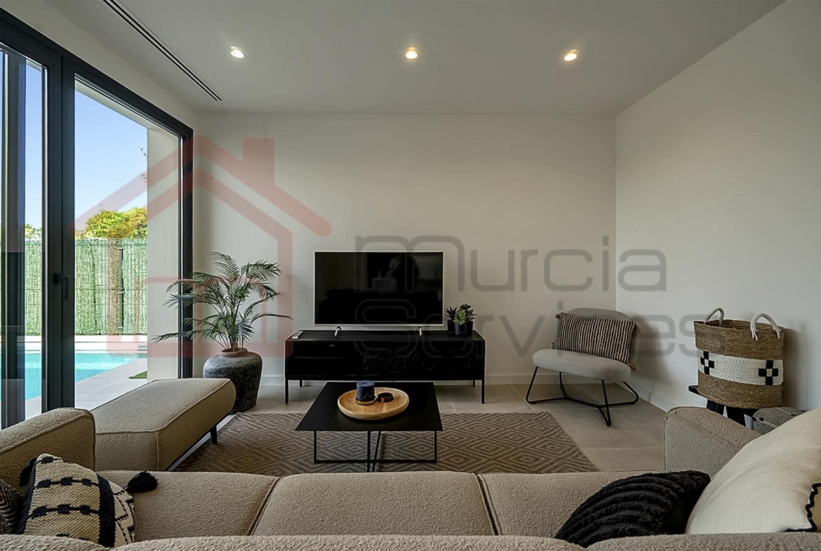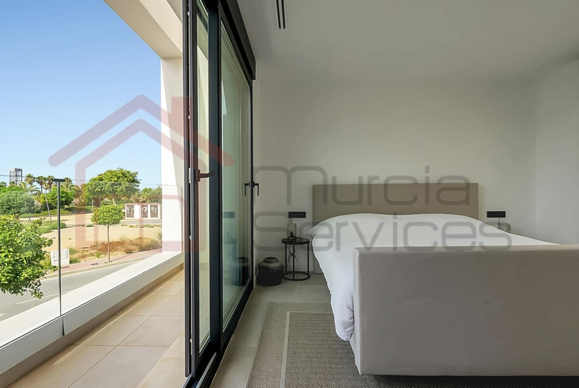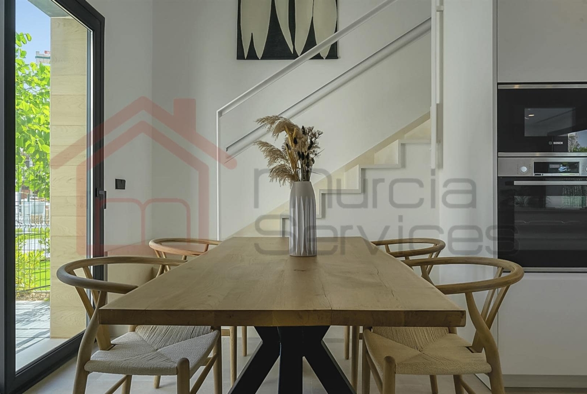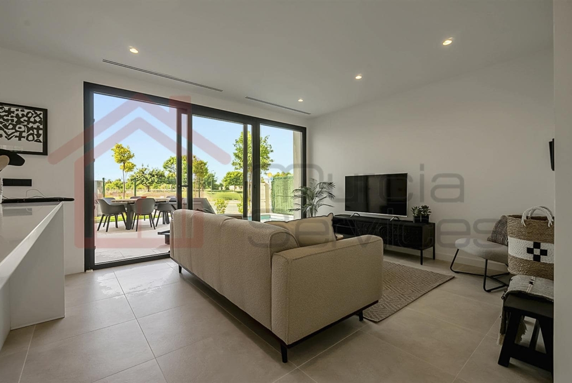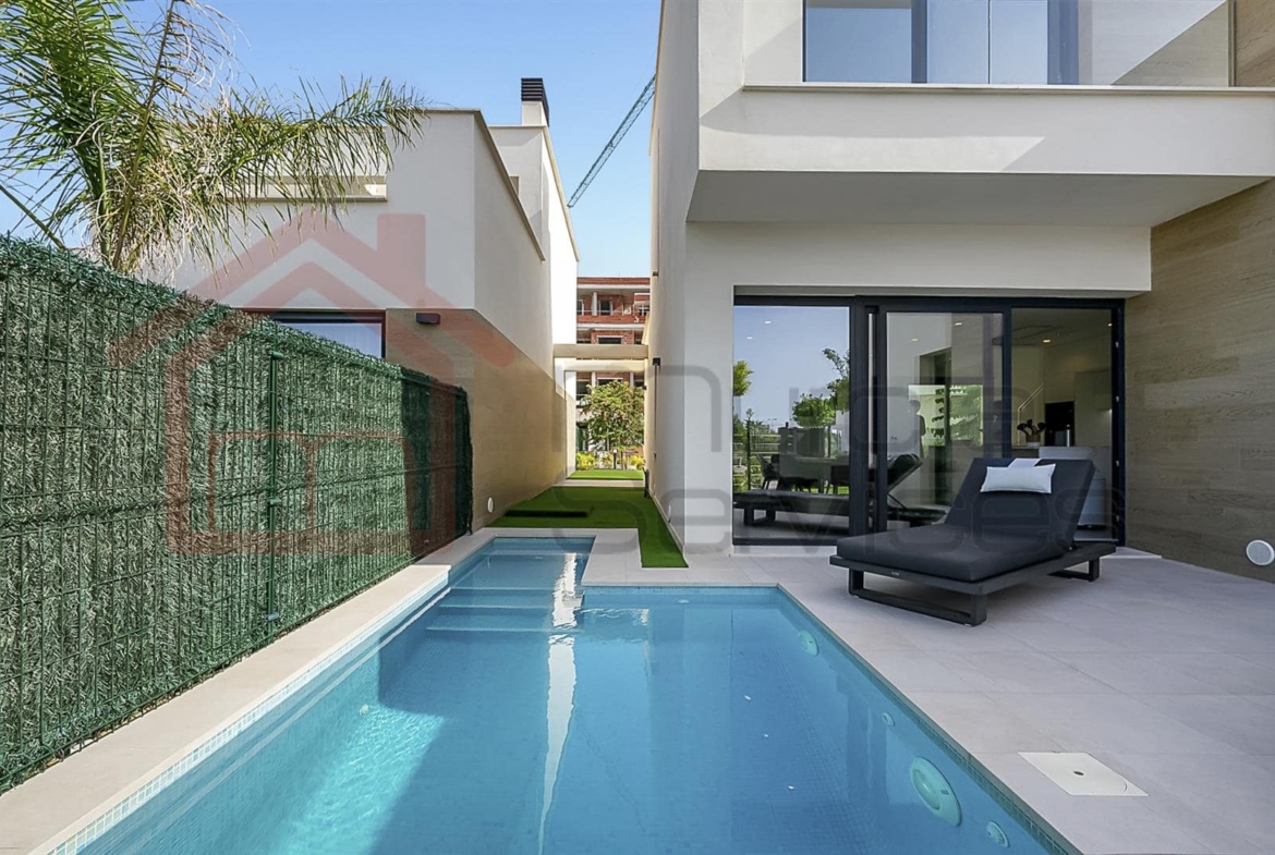 Stunning three bed villa on a corner plot with beautiful finishes.The master bedroom is located upstairs and has a walk in wardrobe and modern en-suite with a walk in shower.The master also has two terraces to enjoy.The second and third bedroom also has fitted wardrobes and access to the garden area.You have an open plan modern kitchen with an island that overlooks the living space.The living room has large sliding glass doors to create an indoor outdoor living environment.Multiple outdoor seating areas to relax and enjoy the private pool.This property has air conditioning throughout for extra comfort in the summer months.Also there is underfloor heating in all three bathrooms.Electric shutters.8 solar panels. 16,000?m² Crystal Lagoon with sandy beaches and water activities.24 hour securitySouth west facing.There is a gym, mini golf, bike trails, dog park, picnic areas and clubhouse on the resort. The resort is in an ideal location located between Los Alcazares & Torre Pacheco in the region of Murcia on the Costa Calida. Only a 5-minute drive to Los Alcazares, Mar Menor beaches, services, amenities and sports and leisure facilities. There are also numerous golf resorts in the area known as a golfers paradise. Also being only a few minutes drive from the AP-7 motorway makes it easy to commute to places like Cartagena, Alicante, Benidorm, etc