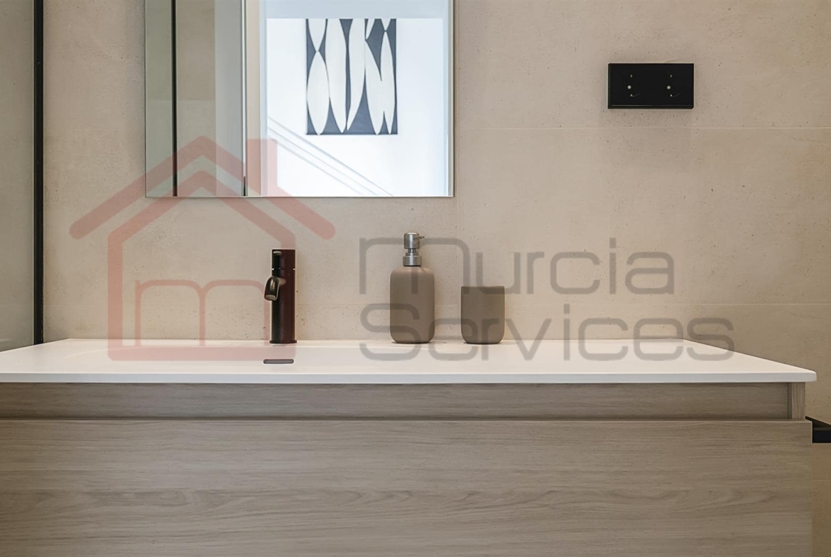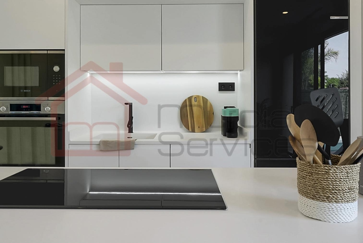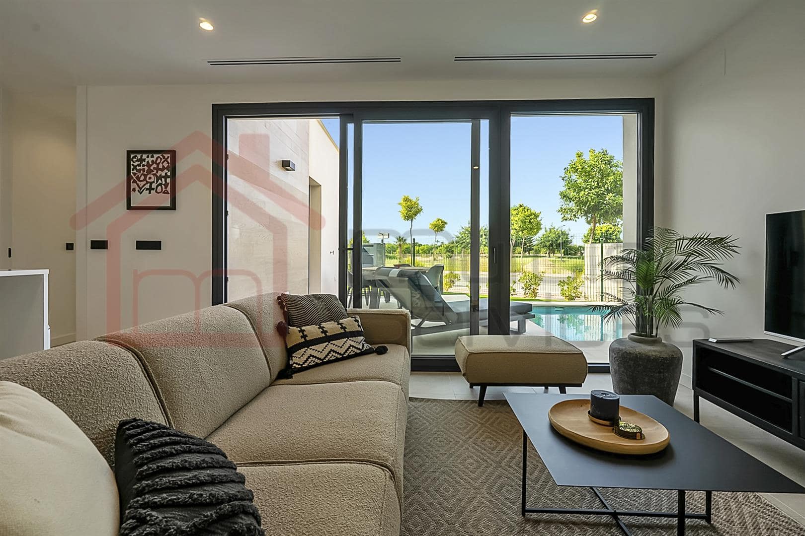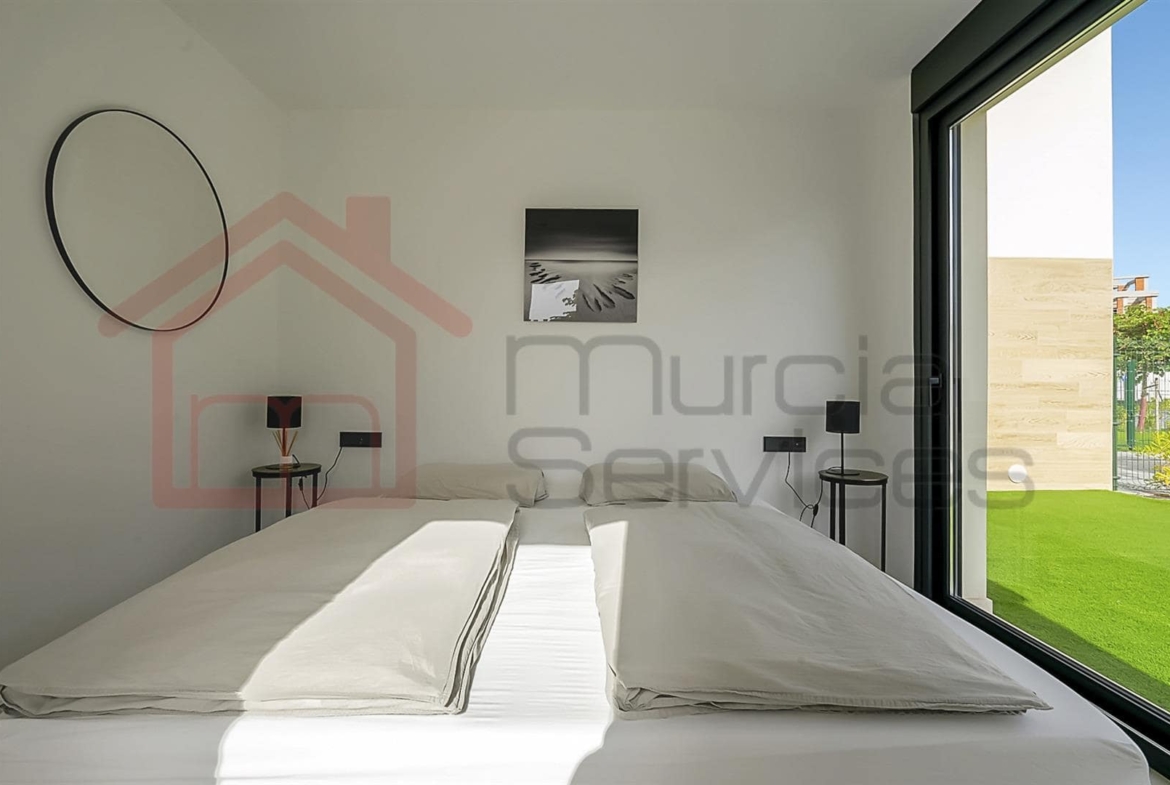 Stunning three bed villa on a corner plot with beautiful finishes.The master bedroom is located upstairs and has a walk in wardrobe and modern en-suite with a walk in shower.The master also has two terraces to enjoy.The second and third bedroom also has fitted wardrobes and access to the garden area.You have an open plan modern kitchen with an island that overlooks the living space.The living room has large sliding glass doors to create an indoor outdoor living environment.Multiple outdoor seating areas to relax and enjoy the private pool.This property has air conditioning throughout for extra comfort in the summer months.Also there is underfloor heating in all three bathrooms.Electric shutters.8 solar panels. 16,000?m² Crystal Lagoon with sandy beaches and water activities.24 hour securitySouth west facing.There is a gym, mini golf, bike trails, dog park, picnic areas and clubhouse on the resort. The resort is in an ideal location located between Los Alcazares & Torre Pacheco in the region of Murcia on the Costa Calida. Only a 5-minute drive to Los Alcazares, Mar Menor beaches, services, amenities and sports and leisure facilities. There are also numerous golf resorts in the area known as a golfers paradise. Also being only a few minutes drive from the AP-7 motorway makes it easy to commute to places like Cartagena, Alicante, Benidorm, etc